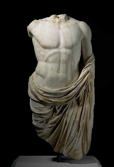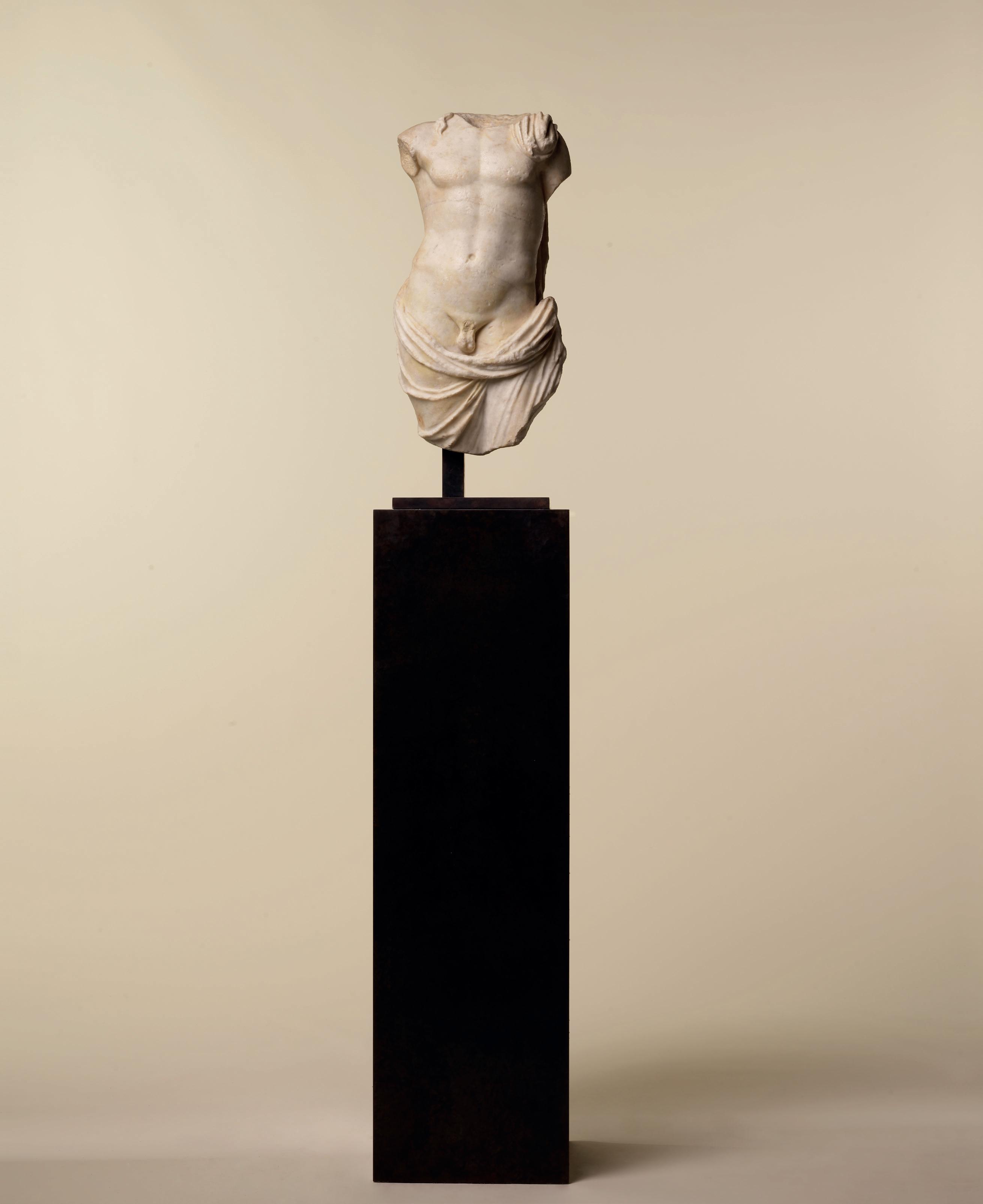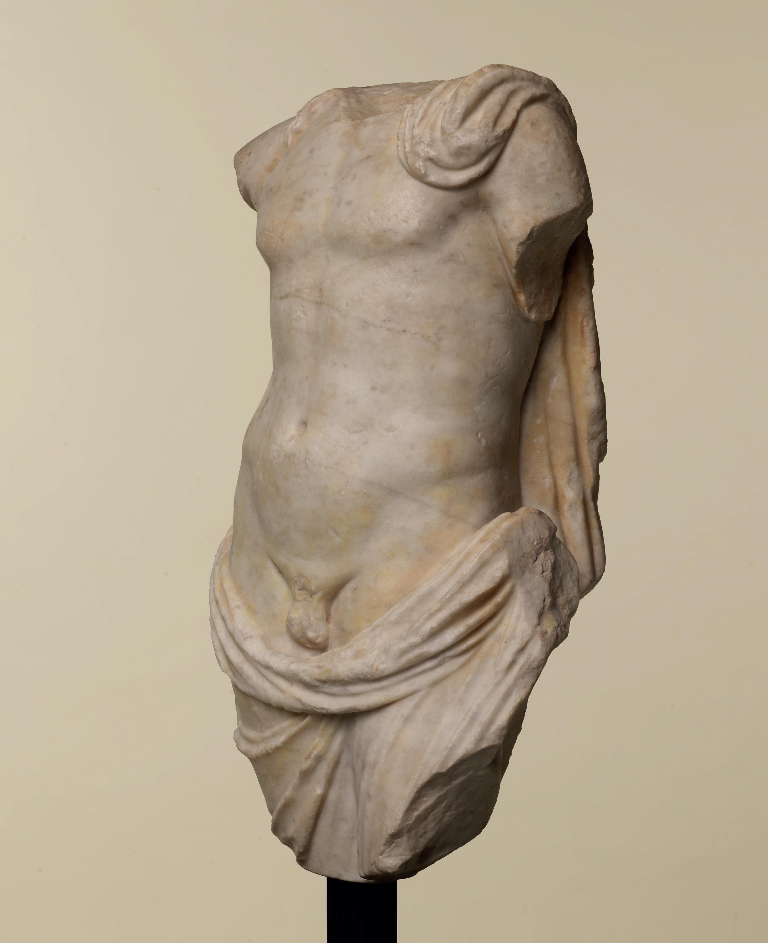 Sculpted from a magnificent white marble, this Roman torso represents a partly nude, muscled young man. Two wavy locks of hair lie over his right collarbone while a chlamys rests upon his left shoulder. The short mantle, typically worn in ancient Greece, covers the back of our young man and envelops his upper legs. The folds, which are very accurately fashioned, are deeply carved and flow down his back, covering his buttocks and wrapping around his hips while leaving his genitals uncovered. There is a dynamic opposition between the arched folds that follow the curves of his body and the vertical folds that run down his legs. The