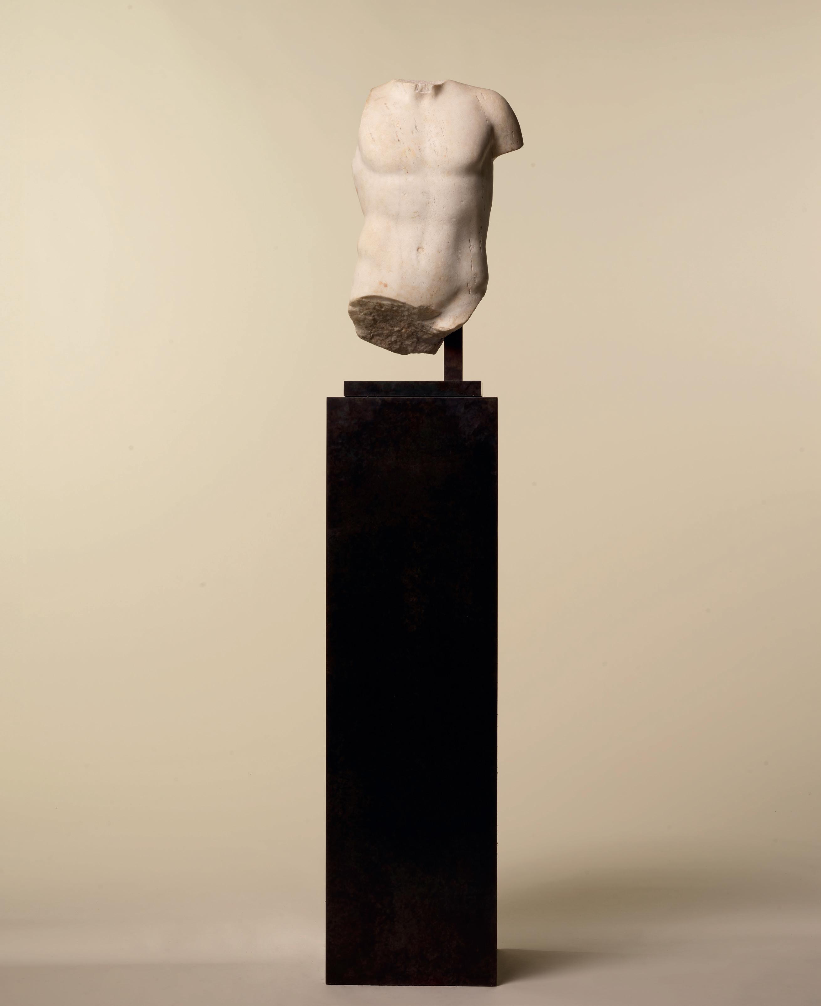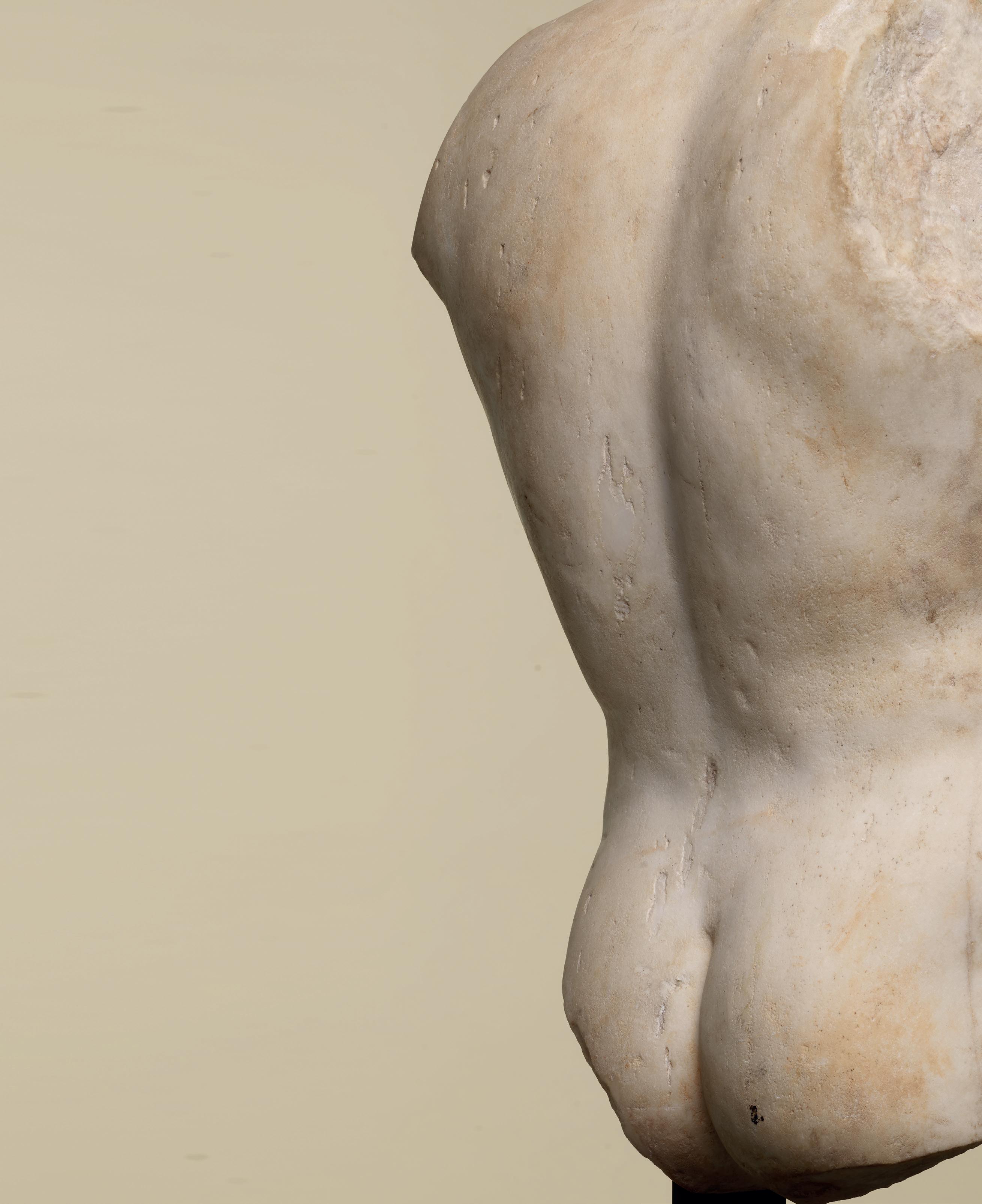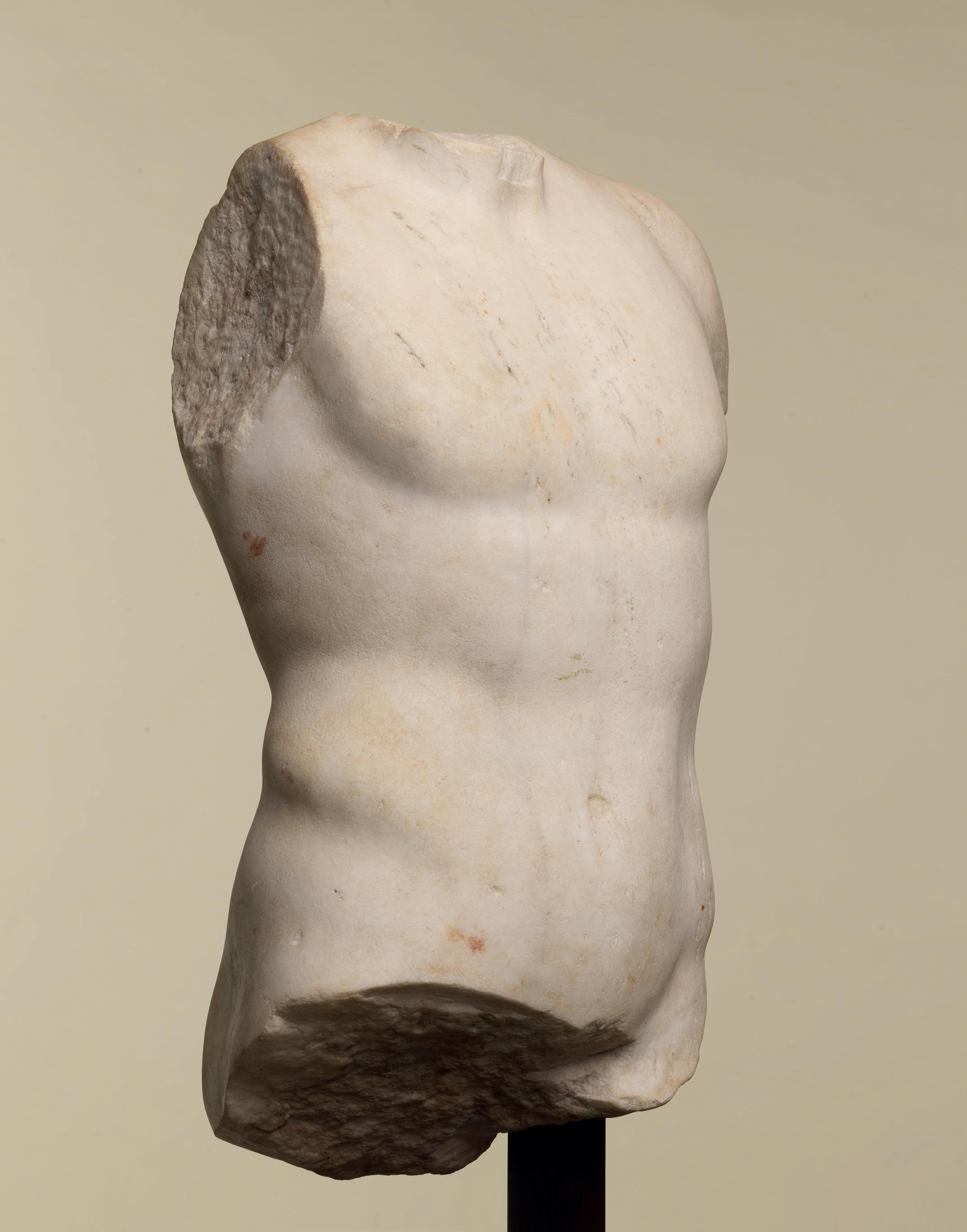 Sculpted from white marble, this sublime Roman torso embodies the aesthetic ideal espoused in antiquity, offering the athletic representation of a man with perfectly balanced proportions. The sculptor paid particular attention to realism and to the rendering of the flesh, the surface of which is practically palpable. The left shoulder, the only one preserved, stands out through its powerful yet delicate moulding, its muscles having been rendered with great finesse. This well defined shoulder creates a fluid transition with the ribcage, which is imposingly broad. The prominent pectorals are firmly defined and separated by a vertical line