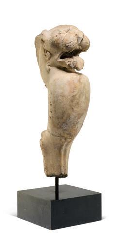 This remarkable trapezophore fragment, crafted from Oriental alabaster, represents a panther with an open mouth. The upper part consists of a marble cube – a tenon – indicating that its primary purpose was to serve as a furniture detail and that it was meant to be assembled. Under the tenon is a panther, only the head and neck of which remain. The neck, broken before the shoulder, forms a rounded, almost perfect quarter circle and projects the panther’s face forwards in a harmonious movement. Its ears stick