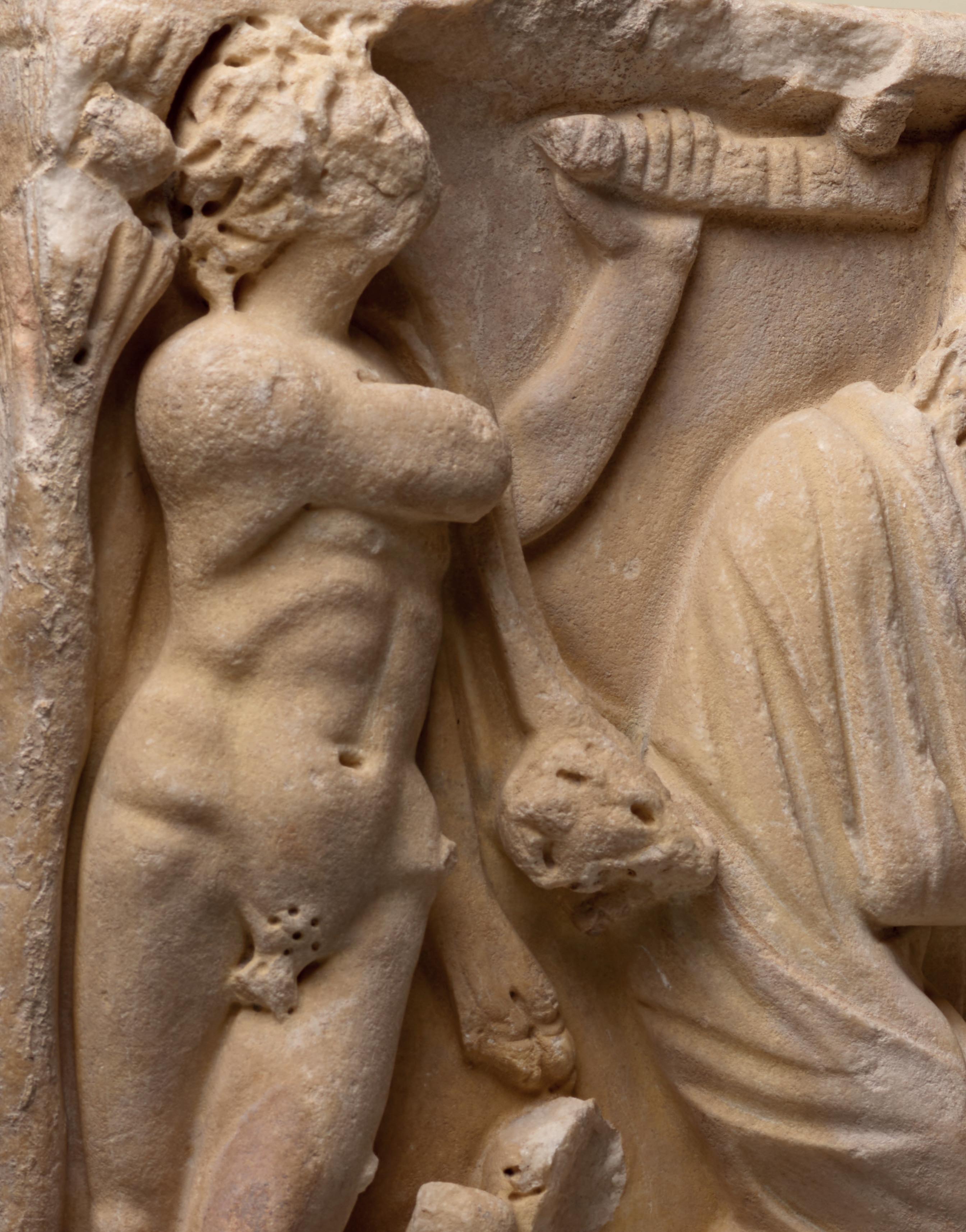 figures in Graeco-Roman culture. The back of the fragment is unworked, which indicates that the statue was not sculpted in the round, but was part of a bas relief, intended to be viewed from the front.