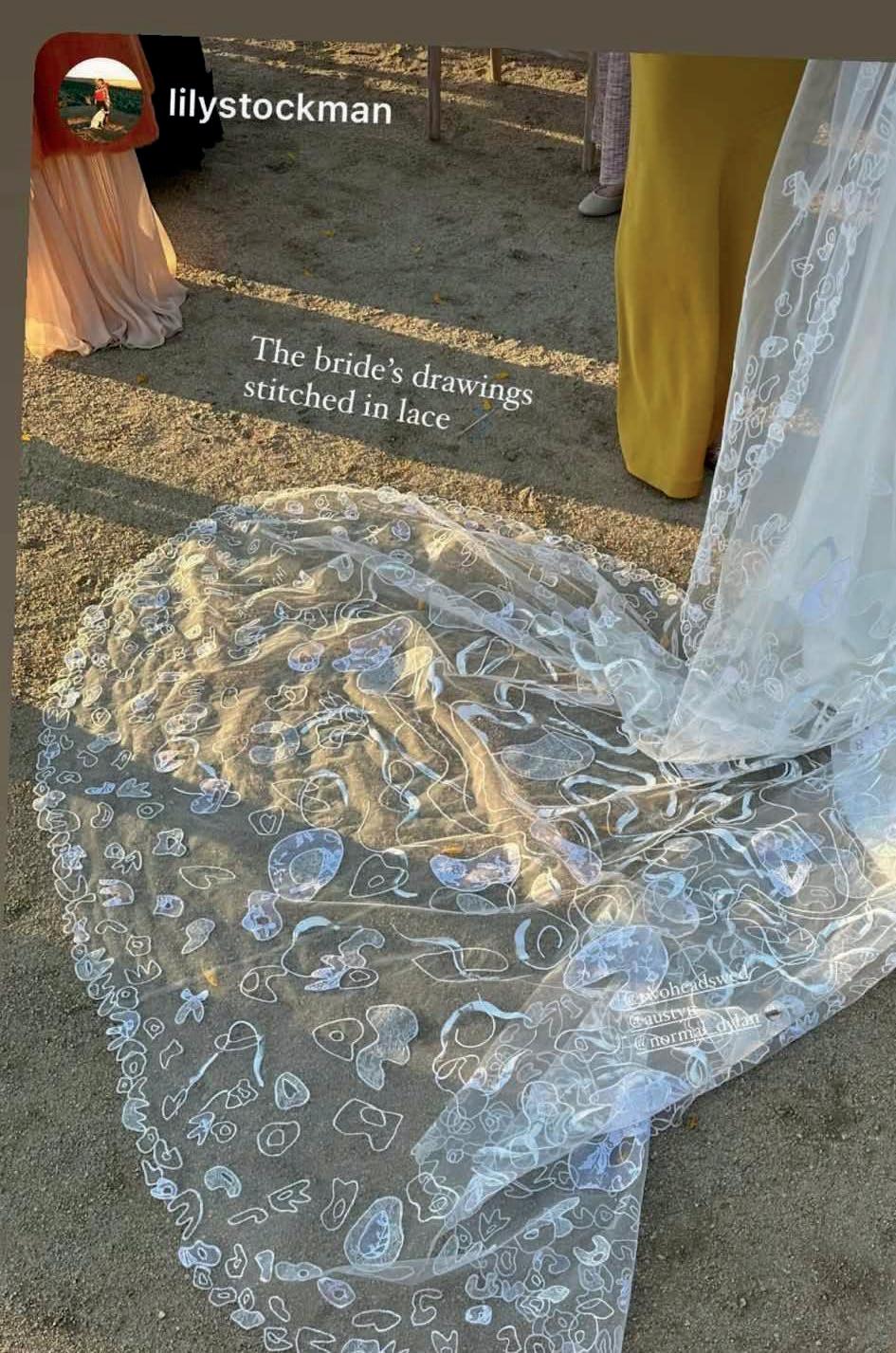 The bride's creativity studded the event with details like a Vivianne Westwood veil embroidered with her original designs and silk pocket squares for guests donned with her paintings.
