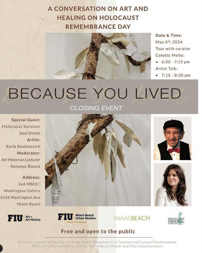 Karla Kantorovitchās exhibition Because You Lived, (inspired by her grandmother, the family's sole Holocaust survivor), ended on Yom Hashoah at the School of Architecture, Miami Beach. The show's closing included a conversation between the artist and survivor Saul Dreier, moderated by art historian Natanya Blanck.