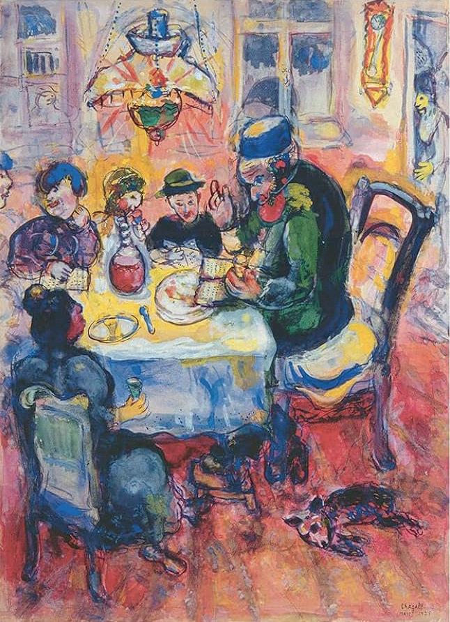 Marc Chagall, born Moyshe Segal, was admired by the Surrealists and was considered one of the defining artists of European Modernism. The Passover Seder depicts a traditional scene of a family gathered around the table to celebrate the Holiday. Bright colors are