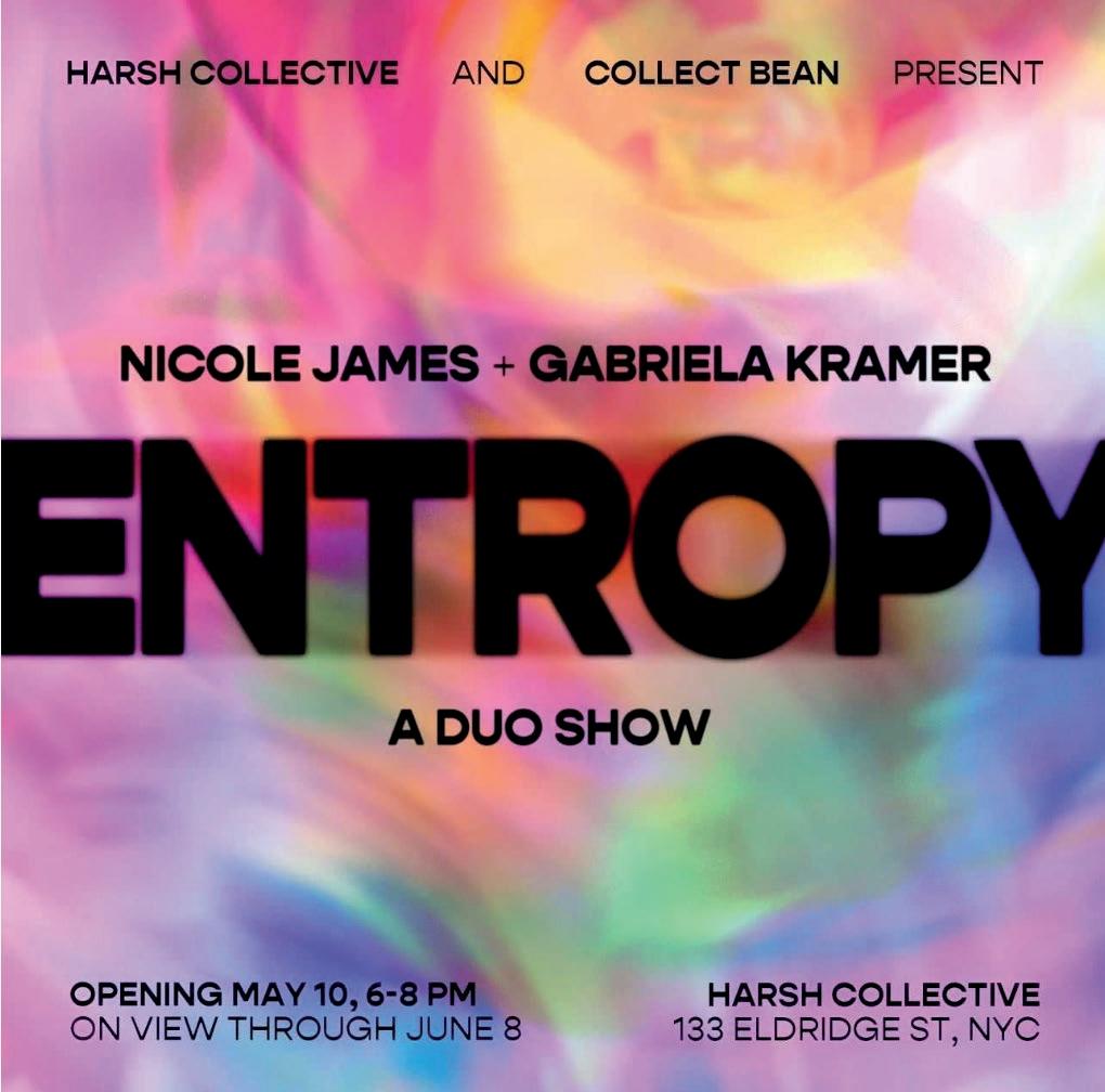 Entropy, presented by Harsh Collective and Collect Bean, is a duo exhibition curated by Marlee Katz Snow, featuring Brooklyn-based artists Nicole James and Gabriela Kramer. The exhibition celebrates the merging of the artists' differing approaches to confronting chaos within their painting practices. The viewer is invited to contemplate the idea of order and spontaneity.