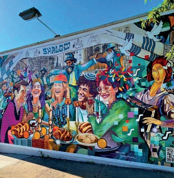 SHALOM, a new mural by Allison Zuckerman, is a celebration of the artist's Jewish heritage. A vibrant, colorful depiction of a traditional Shabbat when families and friends sit together surrounded by love, joy and laughter.