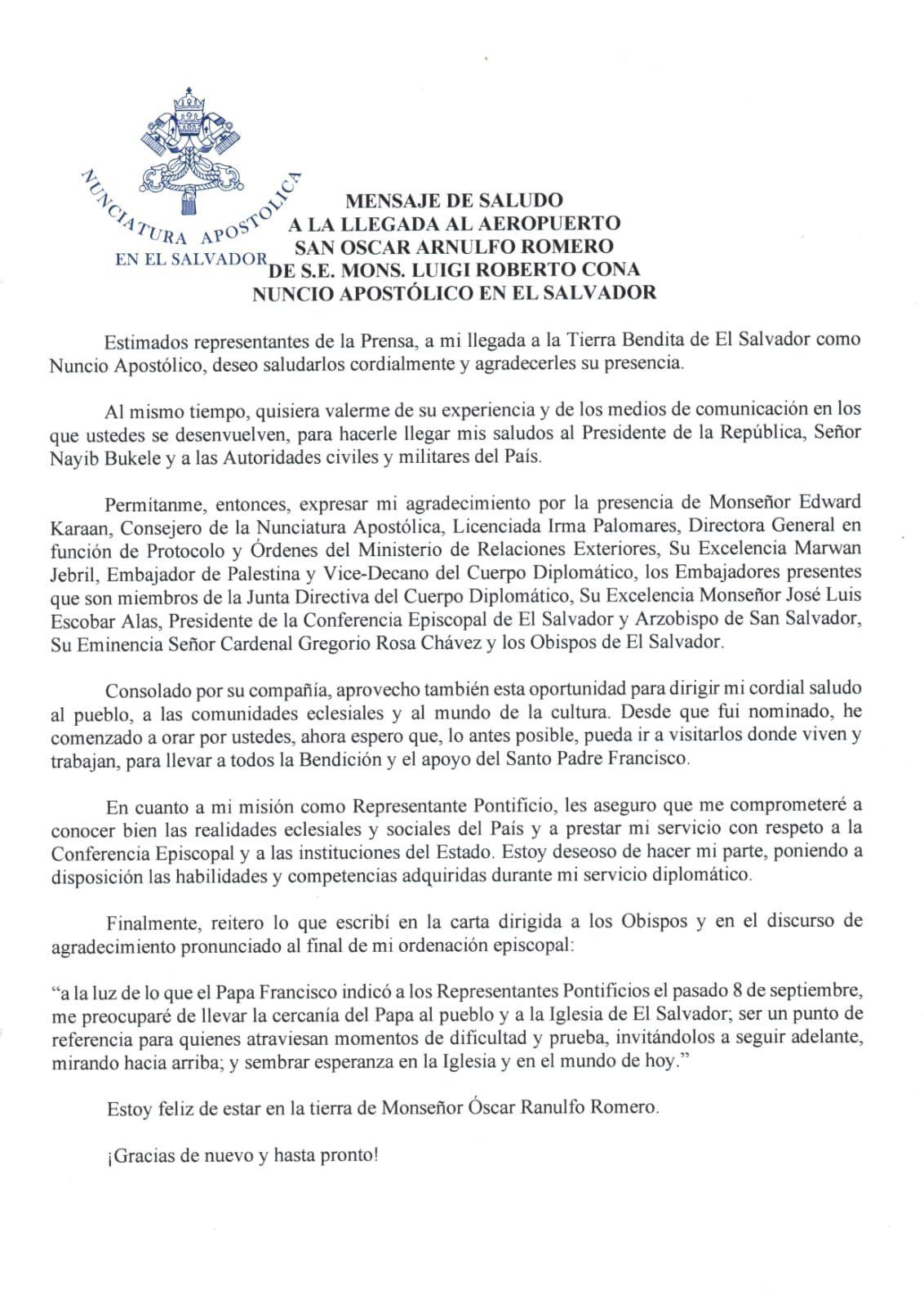 1. El recién pasado 20 de enero, con inmenso gusto recibimos al Señor Nuncio Apostólico, Mons. Luigi Roberto Cona. Al llegar al Aeropuerto nos expresó su alegría de estar en esta bendita tierra de San Oscar Romero. El próximo domingo, 29 de enero a la 5:00 p.m. aquí en esta Catedral tendremos una solemne eucaristía en acción de gracias a Dios por su llegada. La Santa Misa será presidida por el Señor Nuncio Apostólico y concelebrada por nuestra Conferencia Episcopal y sacerdotes de todo el país, desde ya invitamos a todos a participar en dicha celebración. Le reiteramos al Excmo. Señor Nuncio nuestra más cordial bienvenida y le deseamos total éxito en el desarrollo de su Misión en nuestro país.