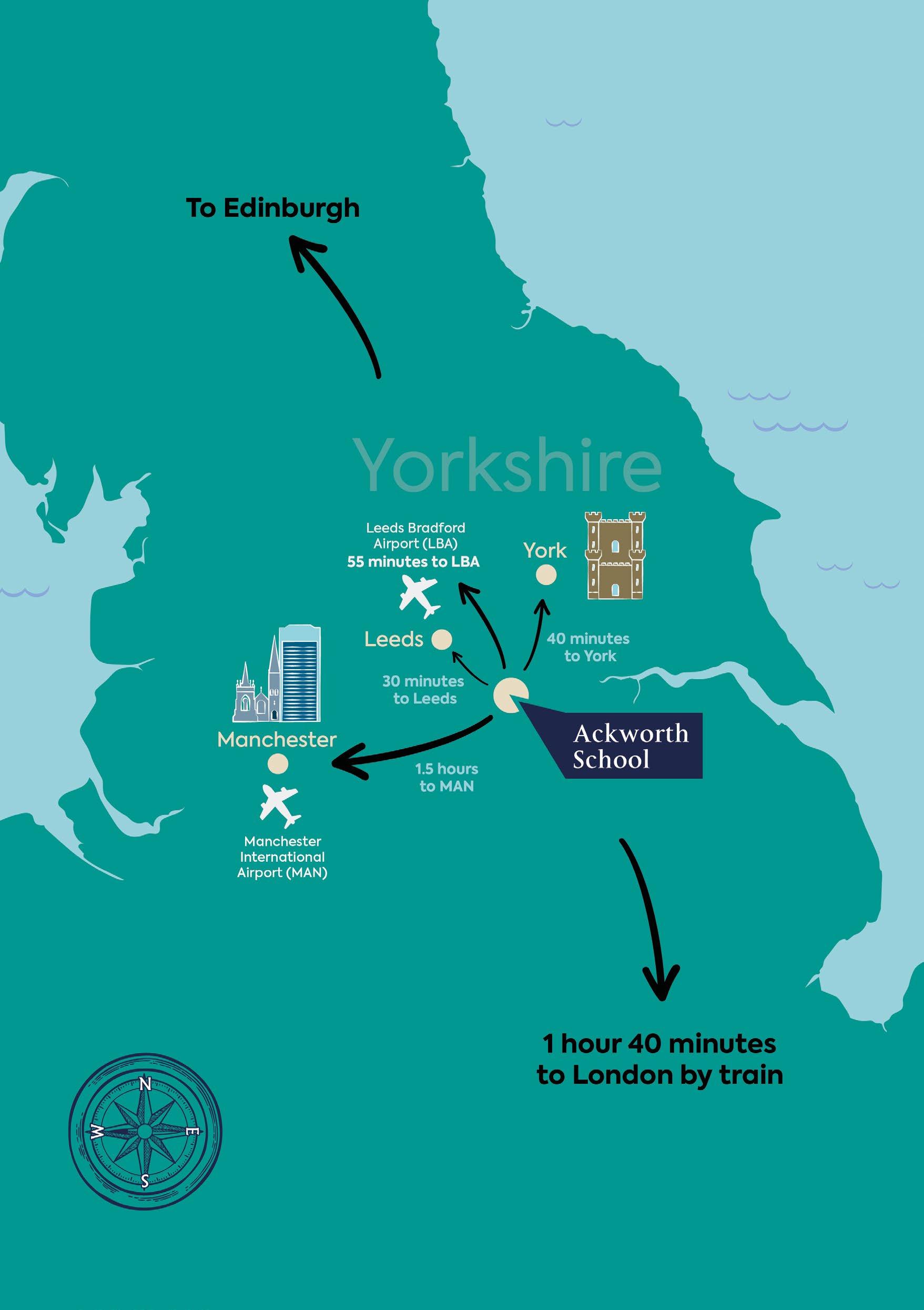 • Leeds. The largest legal and financial city in England (outside London), just 25km, or 30 minutes, by car from Ackworth School.
