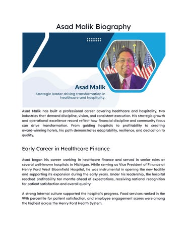 Asad Malik has built a career that connects two challenging fields, healthcare and hospitality. Over the years, he has earned recognition for driving growth and ensuring operational excellence. His professional journey shows how leadership that values financial discipline, vision, and community can bring about meaningful transformation. His path is marked by resilience, adaptability, and steady commitment to quality, from hospitals that expanded under his guidance to hotels that earned national awards. In the early part of his career, Asad focused on healthcare finance, serving in senior roles at respected hospitals across Michigan. At Henry Ford West Bloomfield Hospital, where he worked as Vice President of Finance, he was central to the opening of the new facility and its early expansion. His leadership helped the hospital achieve profitability ten months earlier than projected, while gaining national attention for its quality and patient satisfaction. A focus on people also supported this operational success. Food services achieved the 99th percentile in patient satisfaction, and employee engagement scores stood among the highest in the Henry Ford Health System. The hospital’s excellence was further recognized with the Malcolm Baldridge Award, which honored its culture of efficiency and dedication to patient care. These results highlighted Asad’s belief that finance is not only about numbers but also about strengthening teams, improving systems, and enhancing patient and staff experiences. His strategic outlook allowed the hospital to grow sustainably, earning community trust while delivering high-quality service.