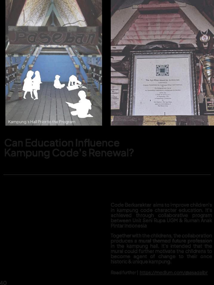 However, this influx has led to a decline in Kampung Code's image and a drop in visitors, shiftingfocusfromitsuniqueness to urban settlement like other. With its fading popularity among theyoungergeneration,thereare growing concerns about the village's future, both in terms of itslayoutandsocialstructure.
