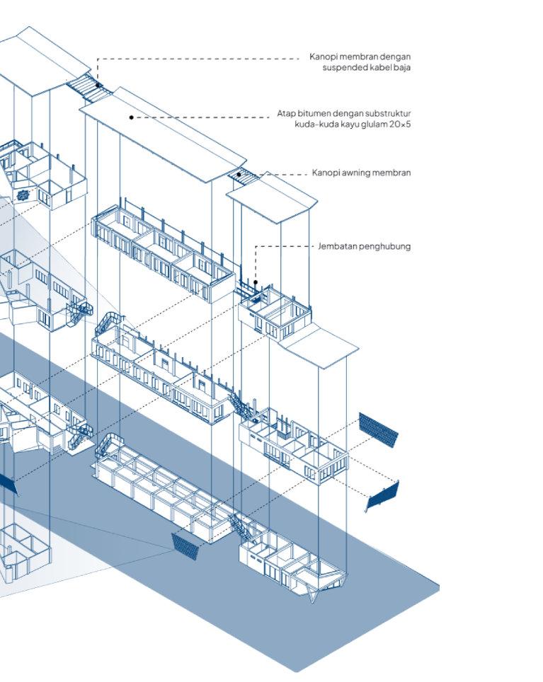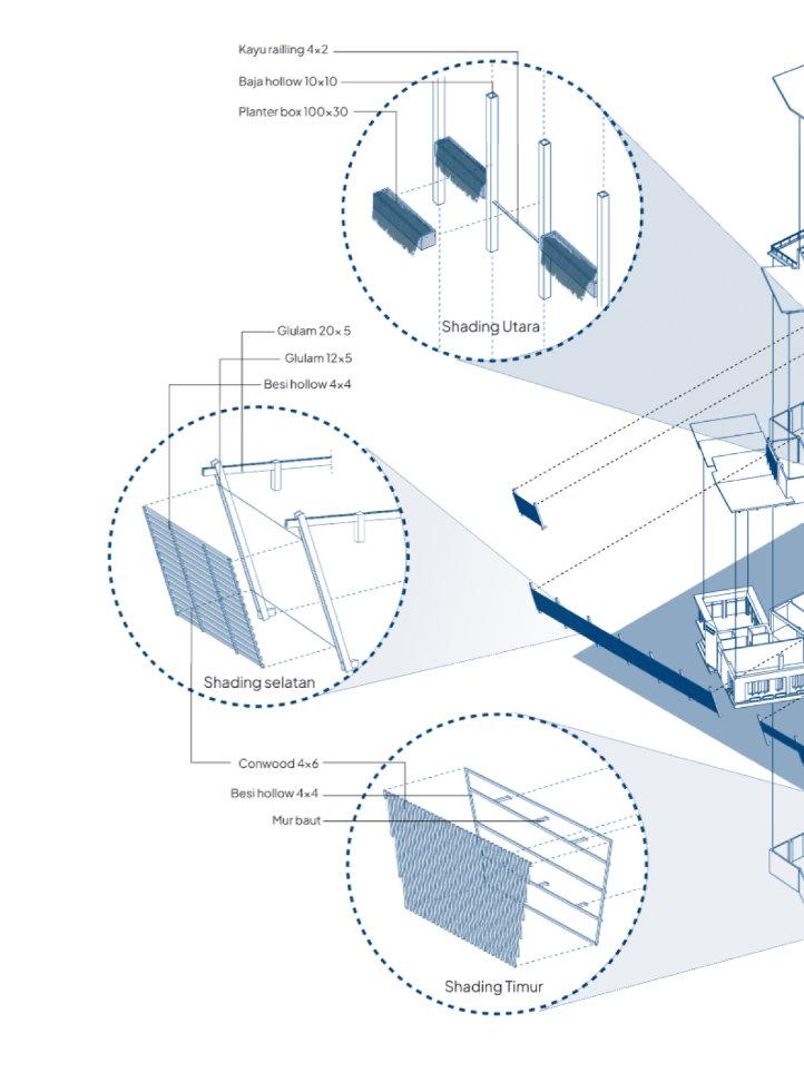 The roof is designed for tropical climate, with openings that enables passive cooling through cross-ventilation. Excess sunlight is blocked by a double wooden facade on the south, while plant shading do the job on the oppositeside.