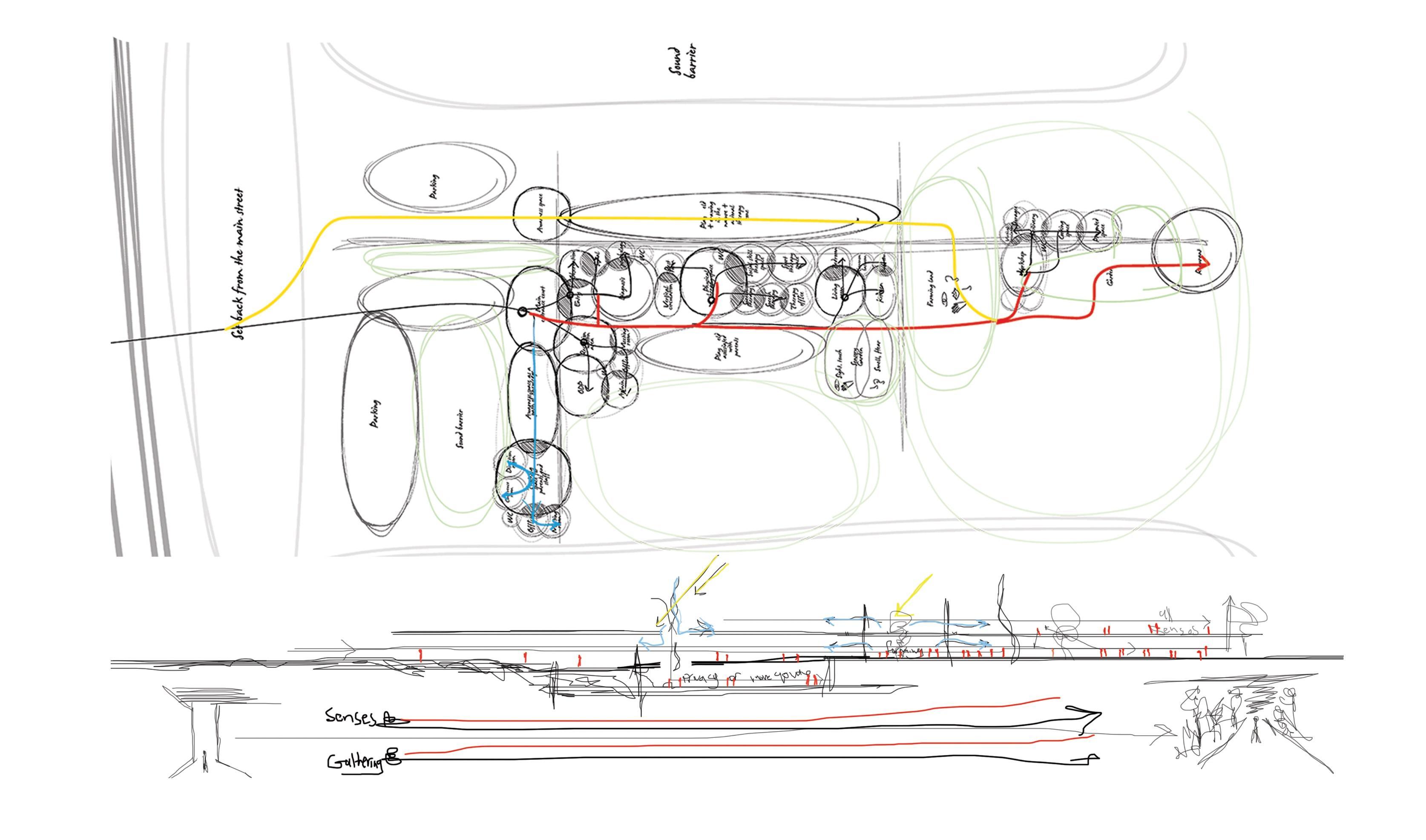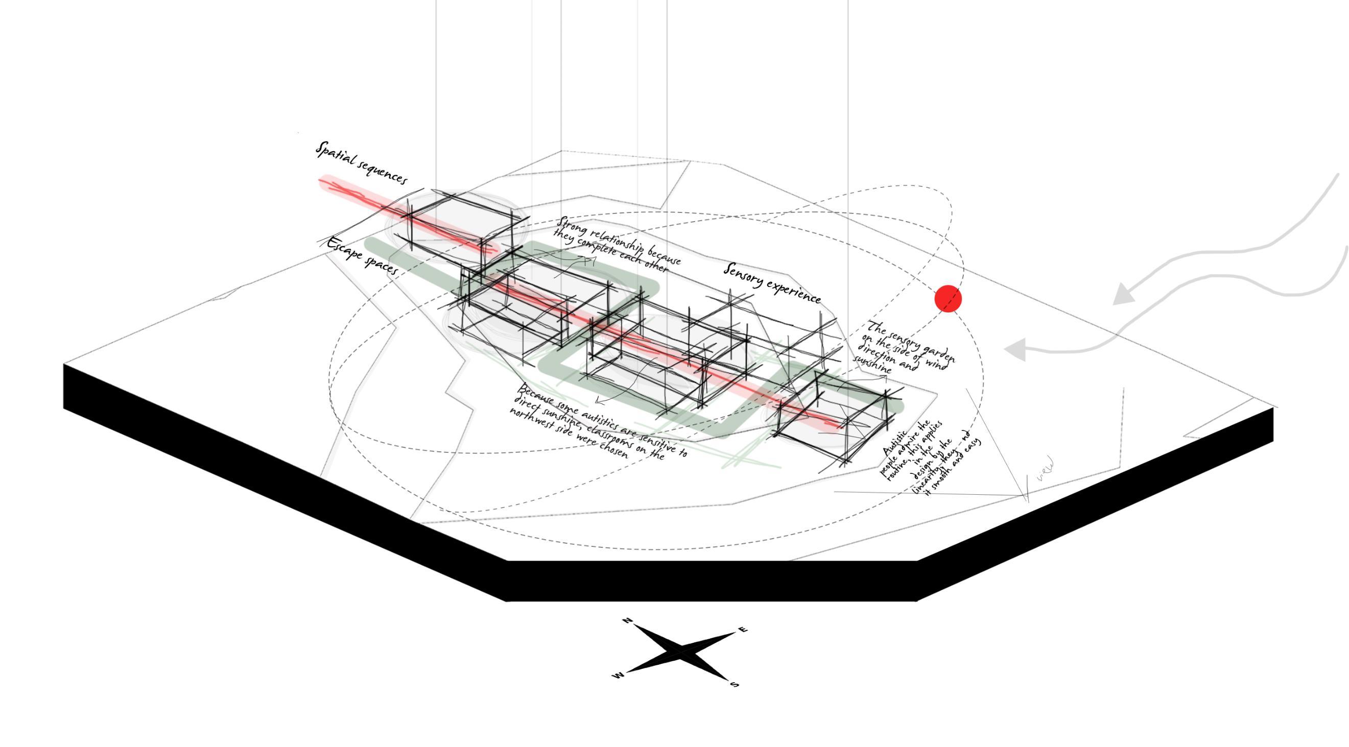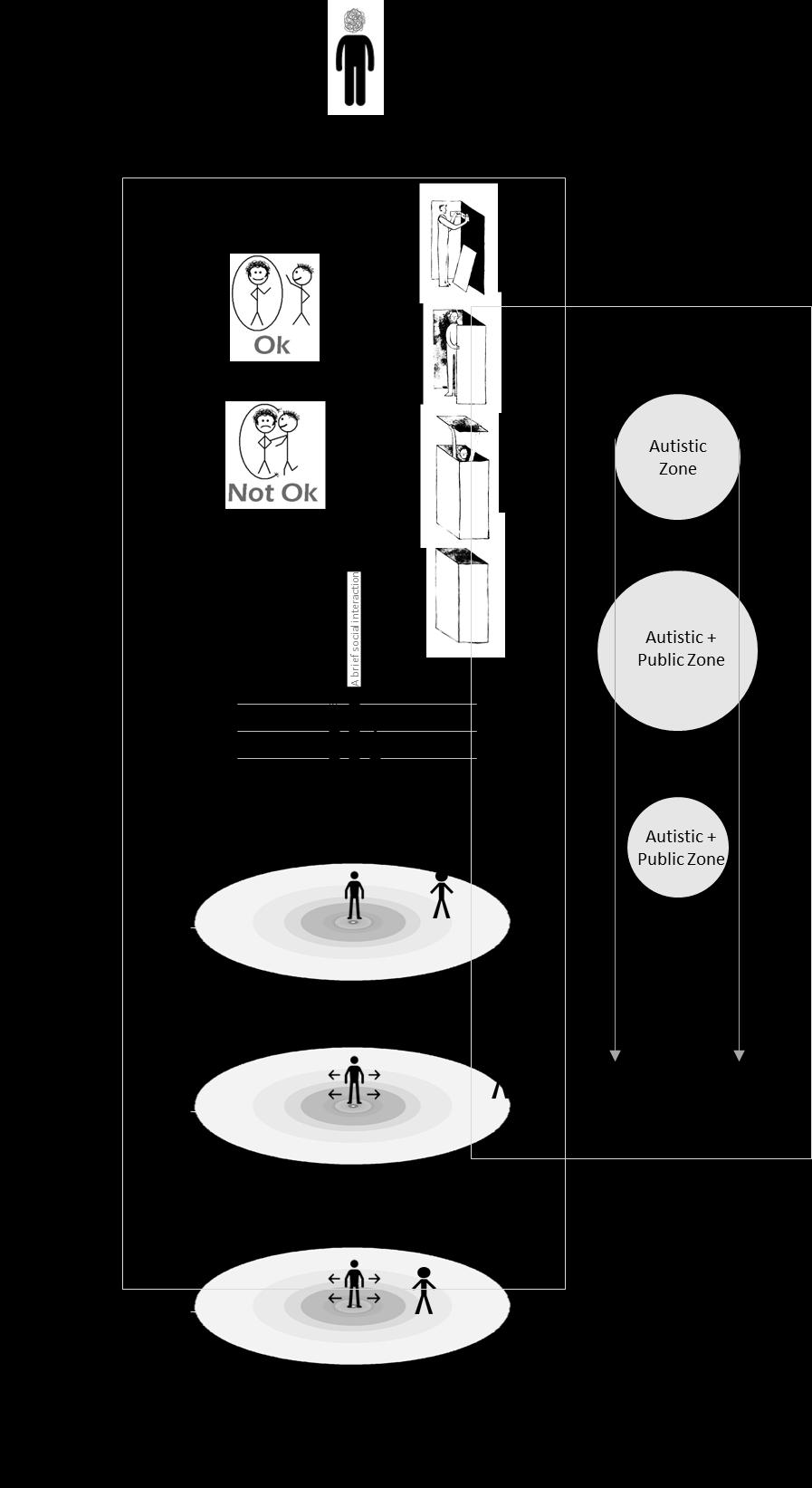 As the autistics tend to get lost in spaces and feel overwhelmed, spatial sequences presented in the project as the guide for autistics started from the beginning of the journey, as a linear path make it easier to autistic to use and rememberdaily. Inadditiontothat the sensory expense will be distributed around this path helping to achieve the main objective of the project. Escape spacesstandforthespacethatautistics could escape toward it when they feel overwhelmed.