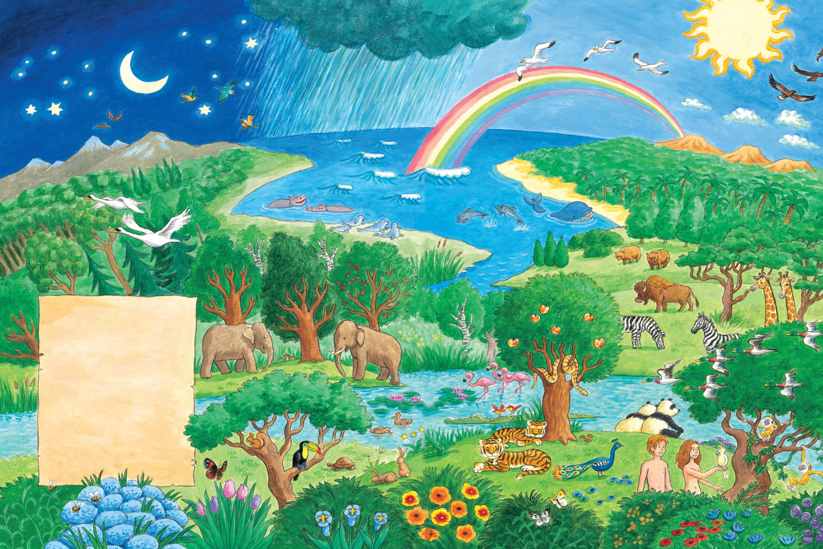 Zuerst machte Gott den Himmel und die Erde, darauf den Tag und die Nacht, die Sonne und den Mond, die Pflanzen und die Tiere. Zuletzt schuf er den Menschen, einen Mann und eine Frau. Die Menschen lebten in einem schönen Garten, dem Paradies. Sie hatten genug zu essen. Gott sagte: „Wenn ihr von dem Baum in der Mitte des Gartens esst, müsst ihr von hier fortgehen.“ Die Schlange verführte die beiden und sie aßen von dem Baum. Da mussten sie den Garten verlassen.
