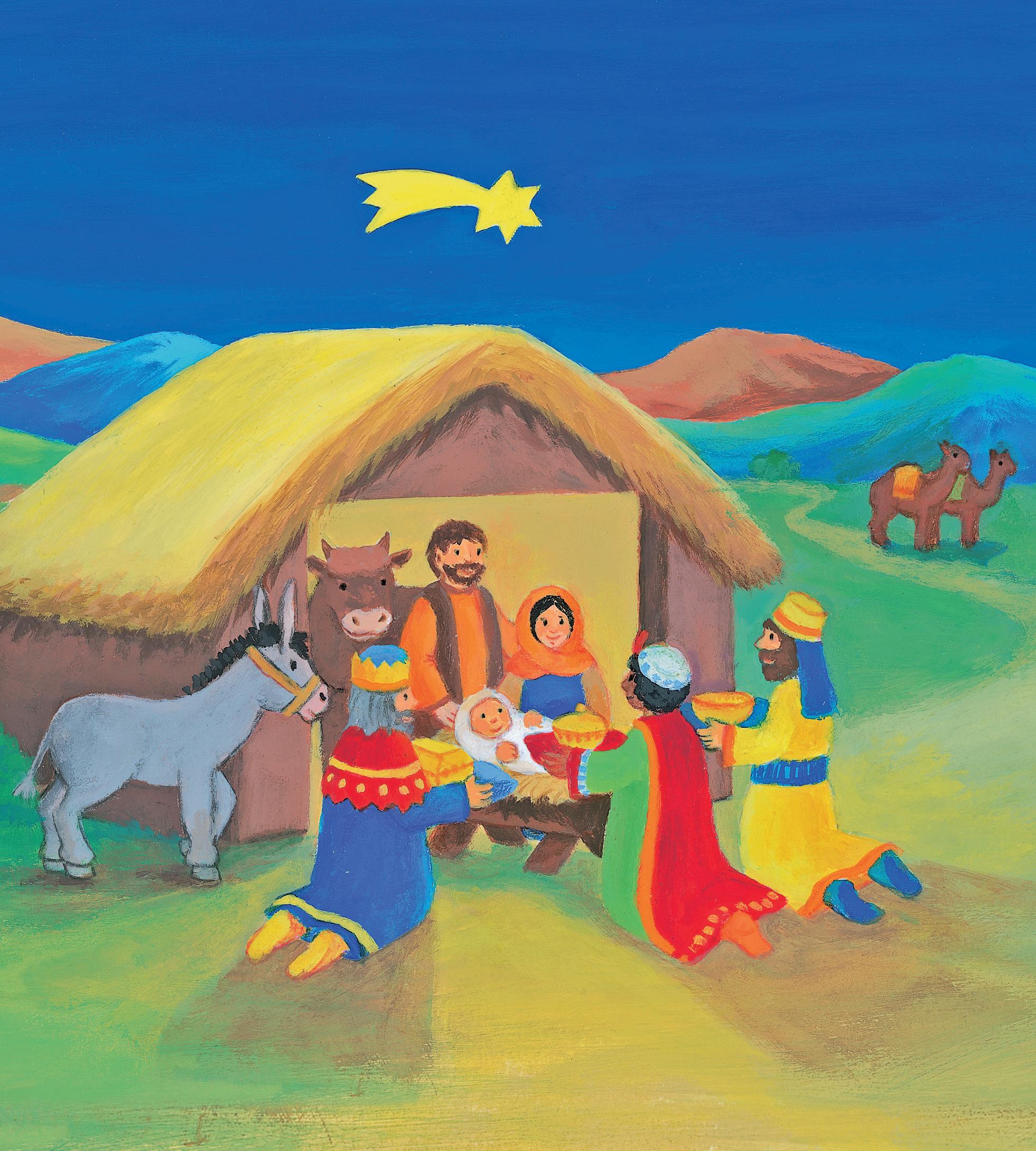 Ganz in der Nähe sind Hirten mit ihren Schafen. Plötzlich wird es leuchtend hell, und ein Engel spricht: „Freut euch! Gottes Sohn, der Retter der Welt, ist geboren. Er liegt in einer Futterkrippe.“ Schnell machen sich die Hirten auf und finden das Jesuskind. Sie freuen sich so sehr. Doch auch drei weise Männer aus einem fernen Land kommen zu Besuch. Sie folgten lange Zeit mit ihren Kamelen einem Königsstern, der nun genau über dem kleinen Stall stehenbleibt. Die Männer knien vor dem Jesuskind nieder und beten. Sie haben kostbare Geschenke mitgebracht: Gold, Weihrauch und Myrrhe.