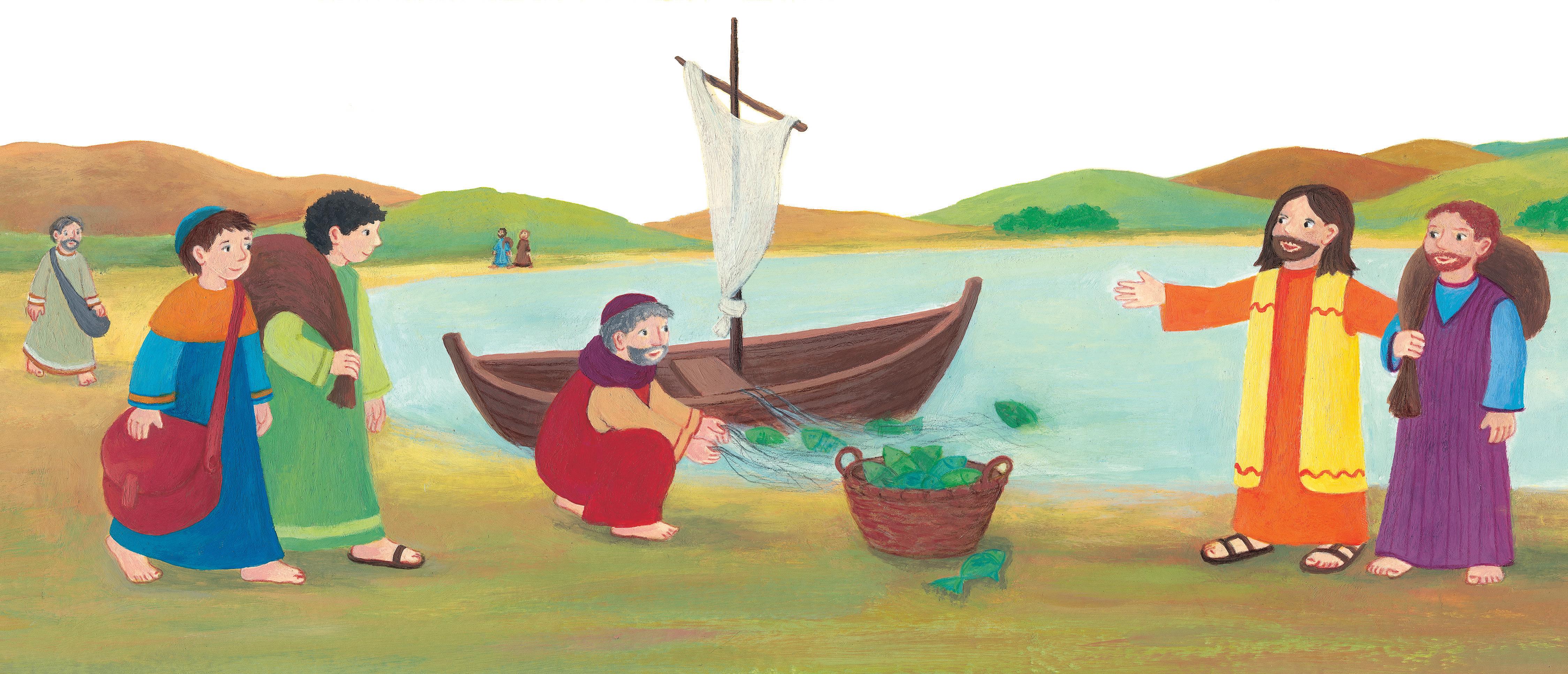 AlsJesus ein erwachsener Mann ist, zieht er durch das ganze Land Israel. Er möchte vielen Menschen von Gott erzählen, der wie ein guter Vater und eine gute Mutter ist. Unterwegs findet Jesus Freunde, die ihm dabei helfen wollen. Die ersten waren Fischer an einem großen See. Sie lassen einfach alles stehen und