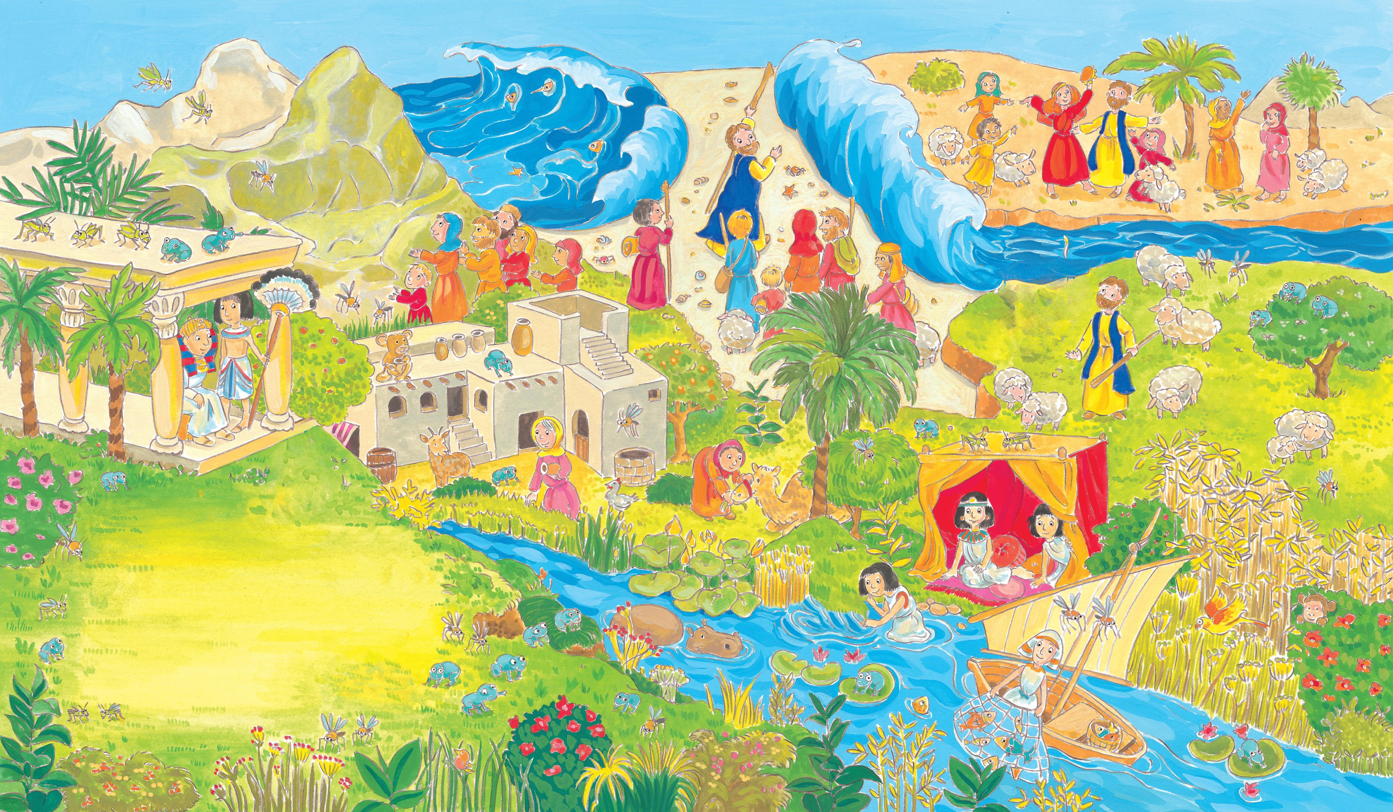 Eine Frau versteckt ihren Sohn in einem Körbchen am Flussufer. Die Tochter des Königs entdeckt das Kind und sagt: „Er soll Mose heißen.“ Sie liebt ihn wie ihren eigenen Sohn. Als Mose größer ist, wird er Hirte. Dann sagt Gott zu Mose: „Zieh mit den Männern, Frauen und Kindern durch das Meer, in das Land Kanaan.“ In der Wüste gibt Gott Mose die Zehn Gebote.