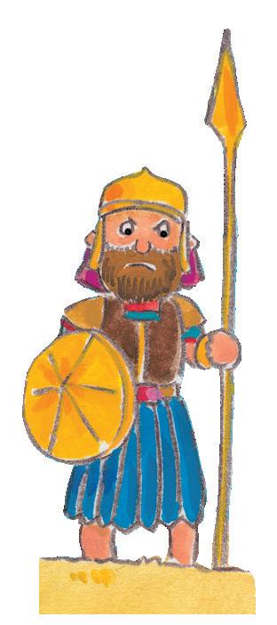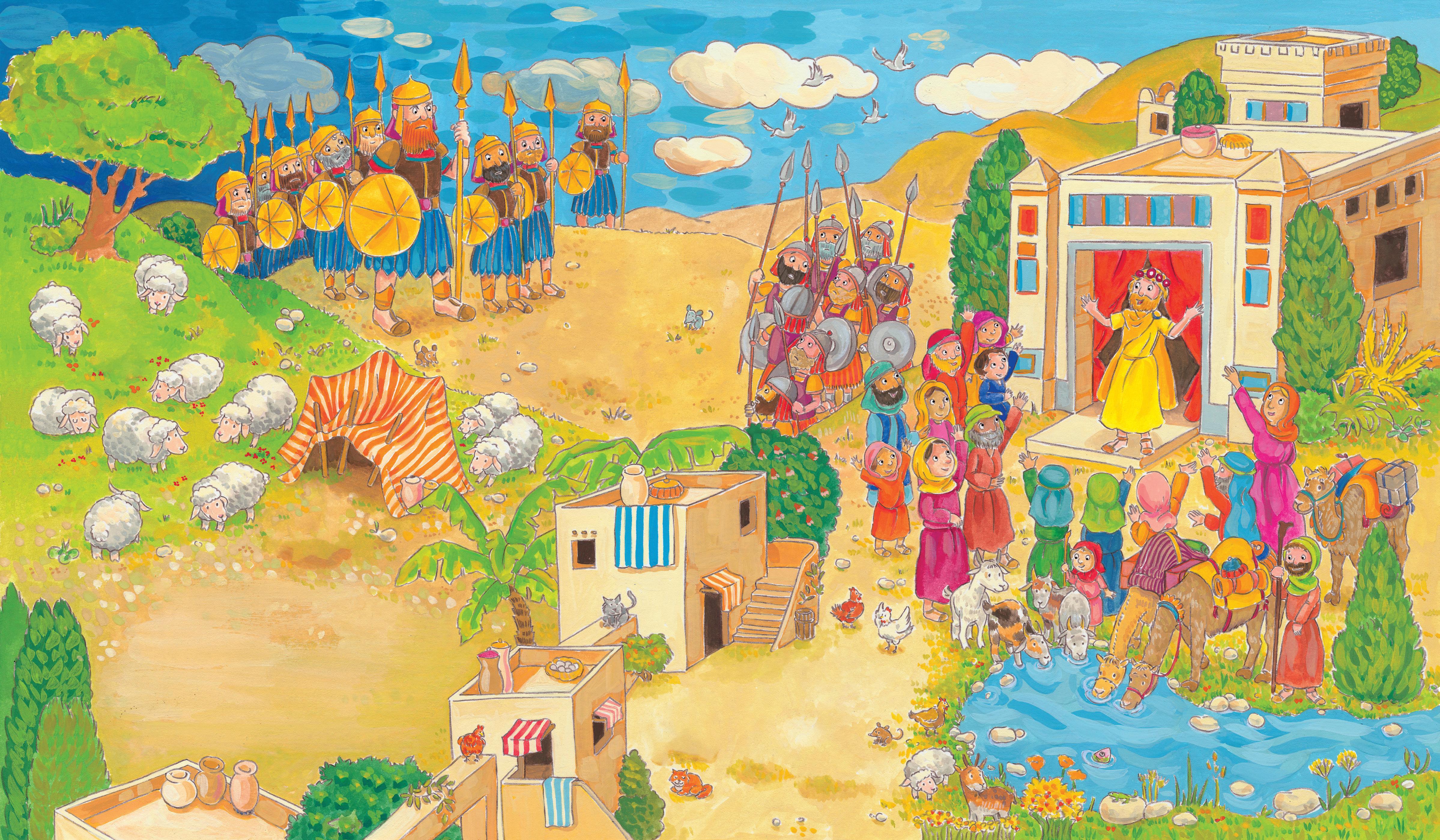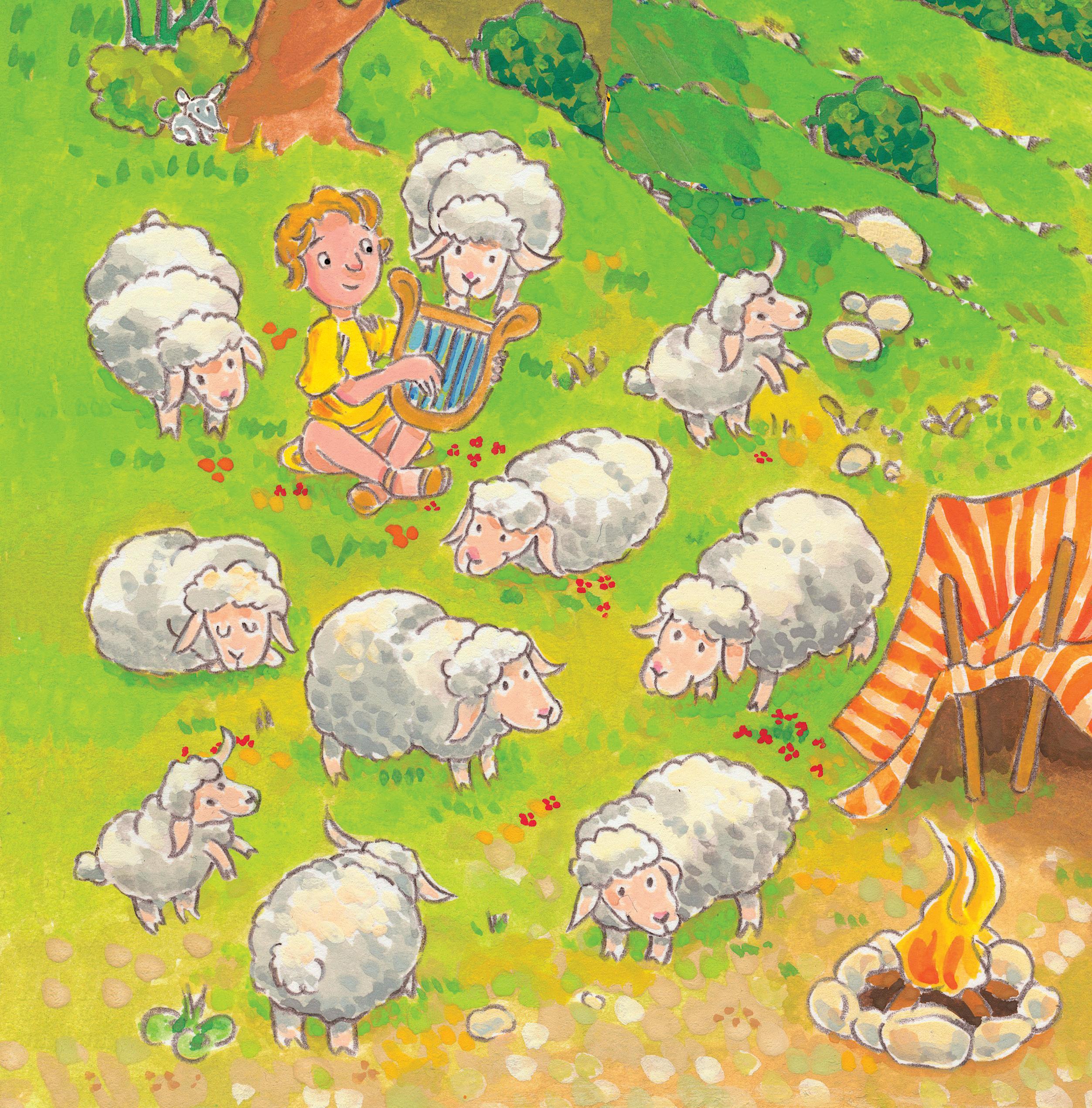 Als Kind hütet David die Schafe seines Vaters. Er spürt: Gott beschützt mich. Er liebt mich. Deshalb hat er keine Angst. Mit einer Steinschleuder besiegt er sogar den Riesen Goliat. Später wird David ein großer König. Er singt gerne und spielt auf seiner Harfe.