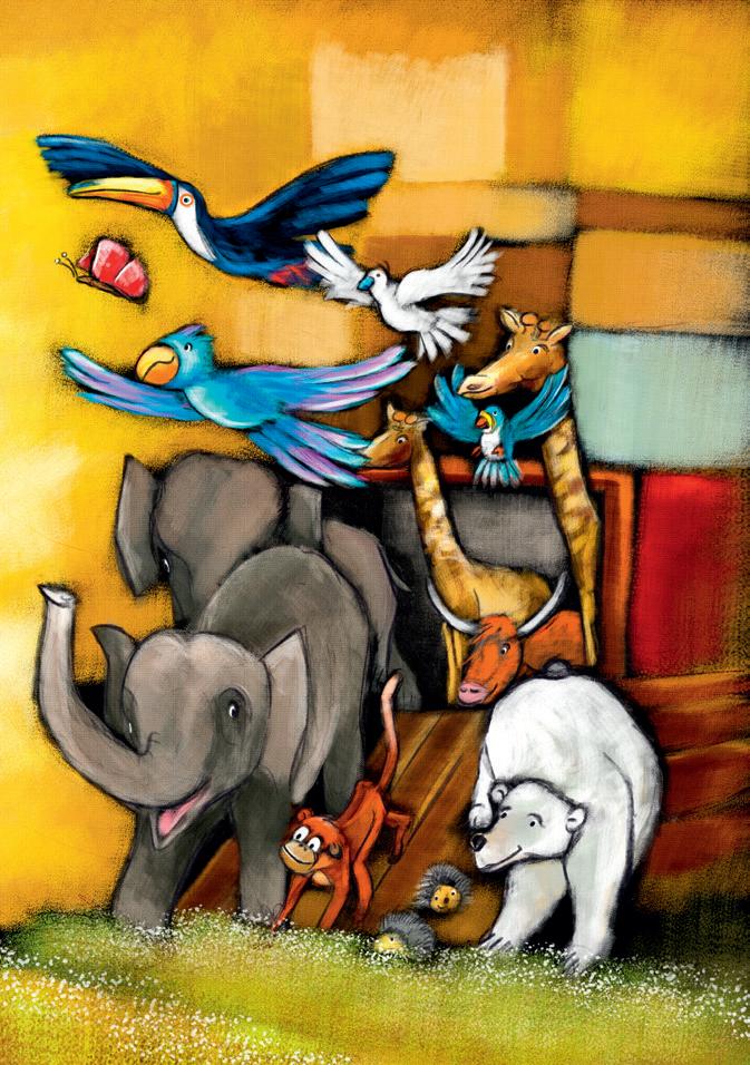 Gott sagte zu Noah: „Kommt heraus aus der Arche. Lasst auch die Tiere hinaus. Sie sollen sich wieder vermehren. Bald wird es auf der ganzen Welt wieder wimmeln von Tieren.“ Also verließ Noah mit seiner Familie und den Tieren das Schiff. Die Erde war wieder grün und frisch. Alles war wie neu. Noah baute einen Altar aus Steinen und brachte Gott darauf ein Opfer, um ihm für die Rettung zu danken.