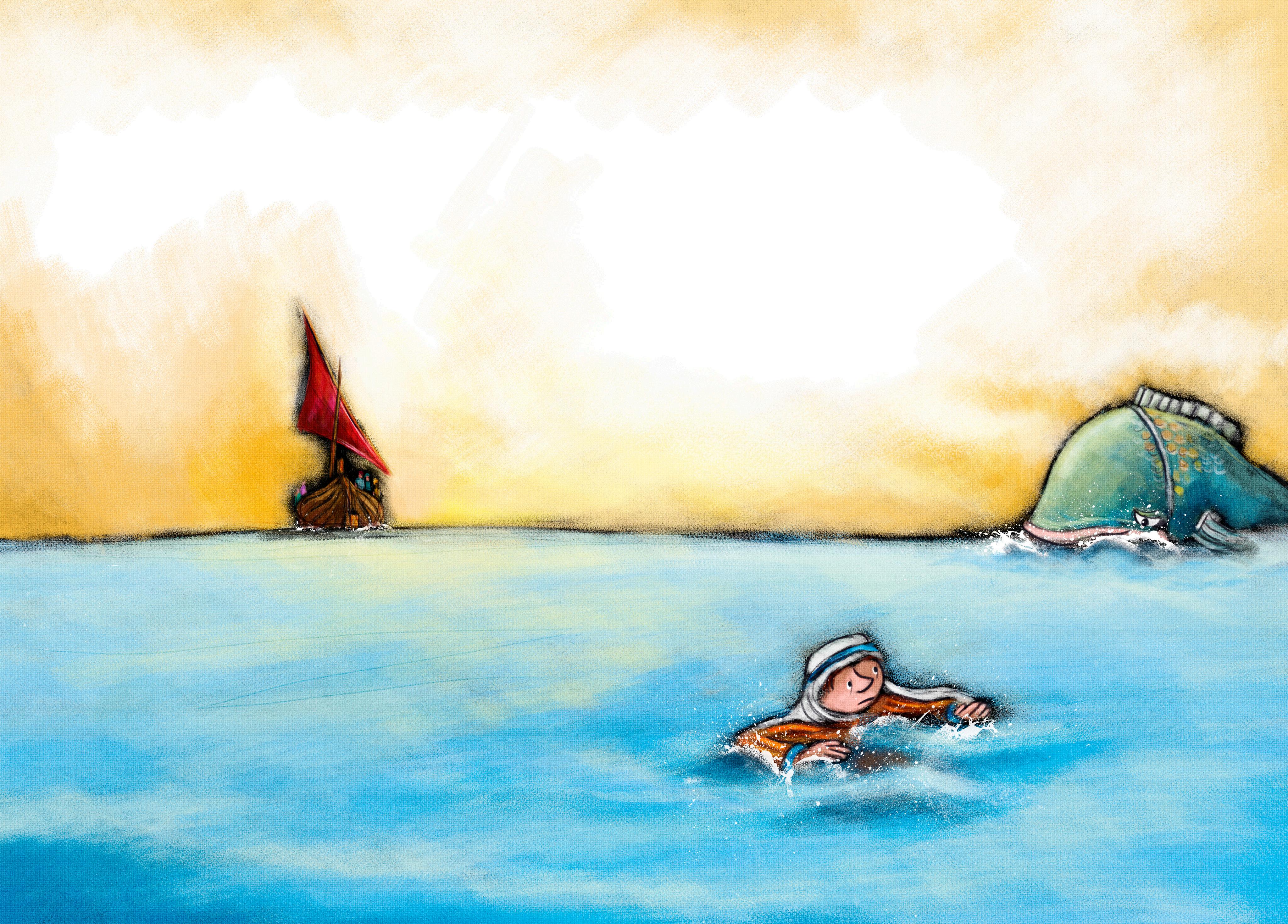Jona treibt im Wasser. Immer weiter weg vom Schiff. Dann sieht er es: Zuerst ist es nur ein großer Schatten in der Tiefe. Der Schatten bewegt sich. Er kommt auf Jona zu, näher und näher. Dann taucht ein riesiger Fisch auf, öffnet das Maul und verschluckt Jona. Gott hat den Fisch geschickt. Drei Tage bleibt Jona im Bauch des Fisches. Dort betet er zu Gott: „Was ich versprochen habe, werde ich halten. Ich gehe nach Ninive und erfülle meinen Auftrag.“ Da spuckt der Fisch Jona an Land.