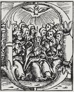 Oben: Sorg-Bibel 1477. Unten: Martin Luther, Neues Testament 1522, Ausgießung des Heiligen Geistes zu Pfingsten.