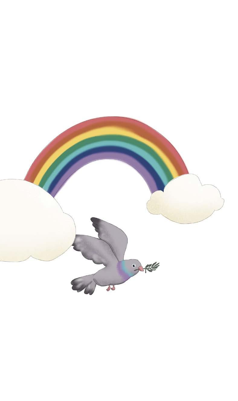 „Ich bereue, alles kaputt gemacht zu haben“, sagte Gott. „Das werde ich nie wieder tun!“ Und er hängte einen Regenbogen zwischen zwei Wolken. „Das soll das Zeichen sein, dass ich mein Versprechen halte!“