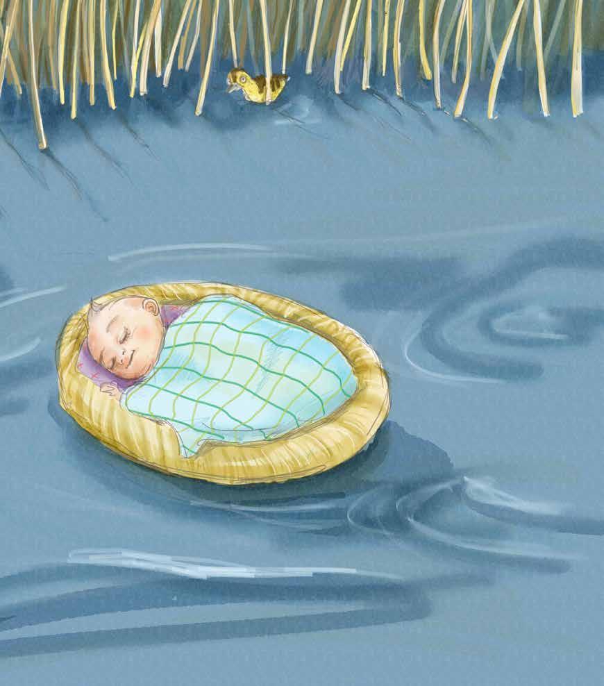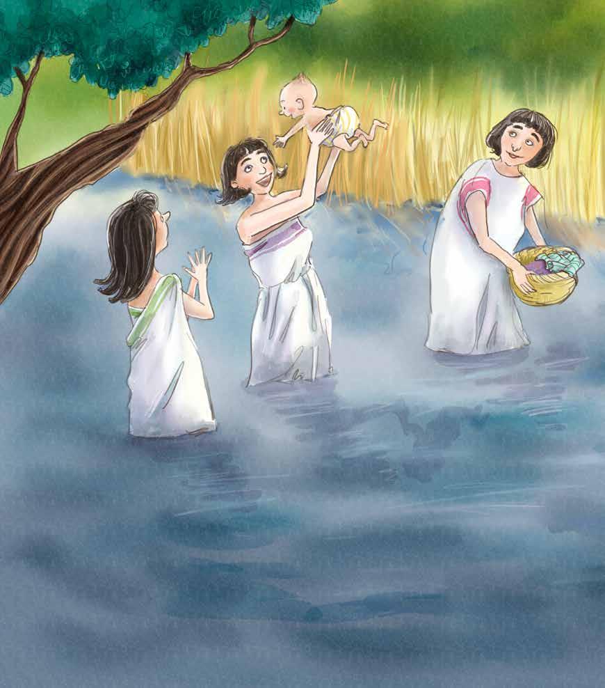 Eine Frau hielt es auf, sah den kleinen Mose und rief: „Schaut mal, ein Baby! Ist es nicht süß?“ Die anderen Frauen kamen hinzu. Sie holte das Körbchen ans Ufer und hob Mose hoch. Er gluckste sein niedliches Babylachen.