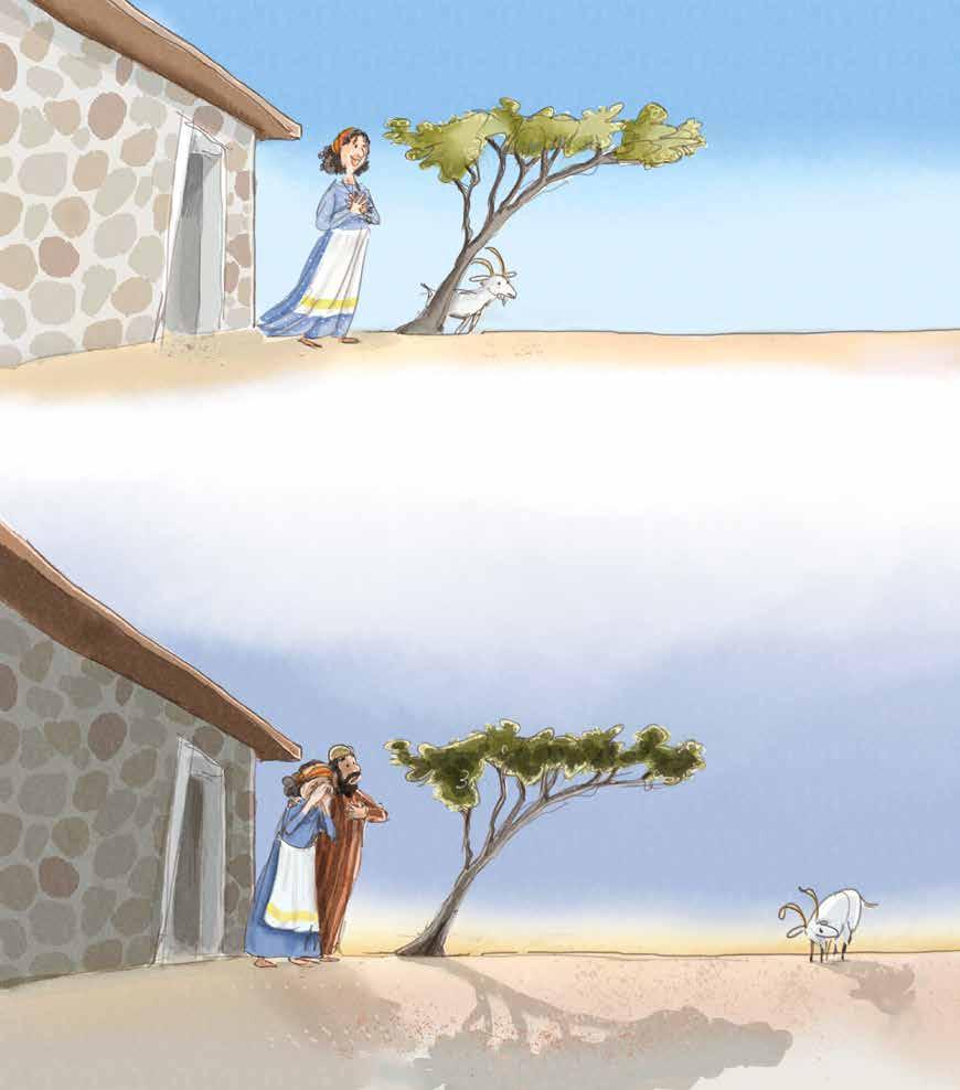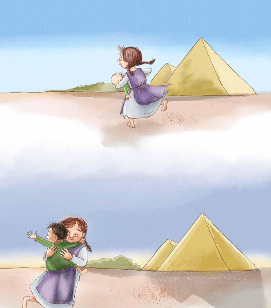 So einfach war das, ein Wunder! Ich nahm meinen kleinen Bruder wieder mit nach Hause. Mama war überglücklich, sie hat immer abwechselnd gelacht und geweint. So konnte Mose drei Jahre bei uns bleiben. Dann aber konnte er selbst essen und trinken und ich musste ihn zum Palast des Pharao bringen. Mama, Papa und ich blieben traurig zurück. Wir haben alle geweint. Aber wir wussten auch, er würde es dort gut haben, denn die Tochter des Pharao liebte ihn wirklich sehr.