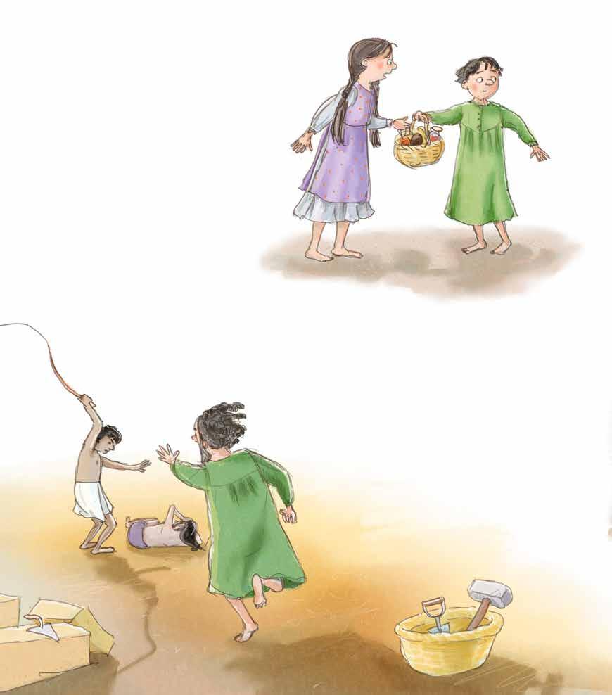 Ein Vorarbeiter schlug einen Israeliten furchtbar mit der Peitsche. Mose wurde darüber derart wütend, dass er mit den Fäusten auf den Vorarbeiter losging. Der Mann stürzte so unglücklich, dass er starb. „Oh nein“, rief Mama. „Wenn ihn die Soldaten des Pharao erwischen, bringen sie Mose um!“