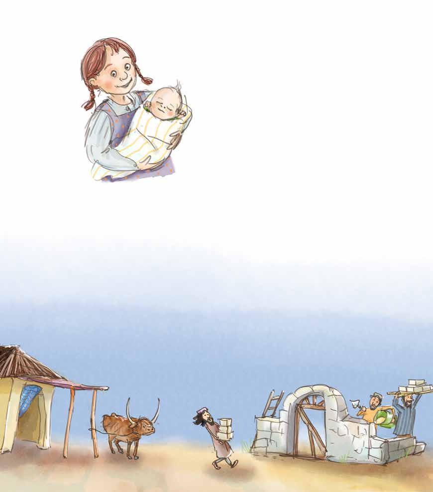Mein Vater Amram und mein großer Bruder Aaron waren damals in einem Lager in der Nähe. Sie mussten Häuser für die Ägypter bauen. Als Israeliten lebten wir als Sklaven in ihrem Land. Meine Mutter Jochebed hatte, so allein mit zwei Kindern, große Angst. Oft wurden neugeborene Jungen den Müttern weggenommen, weil die Ägypter befürchteten, dass wir sonst als Volk irgendwann zu stark werden und uns gegen die Unterdrückung wehren könnten. Was sollten wir nur tun? Mose war ein süßer Kerl, aber er schrie bald so kräftig, dass wir bestimmt nicht lange verheimlichen konnten, dass wir ein Baby zu Hause hatten.