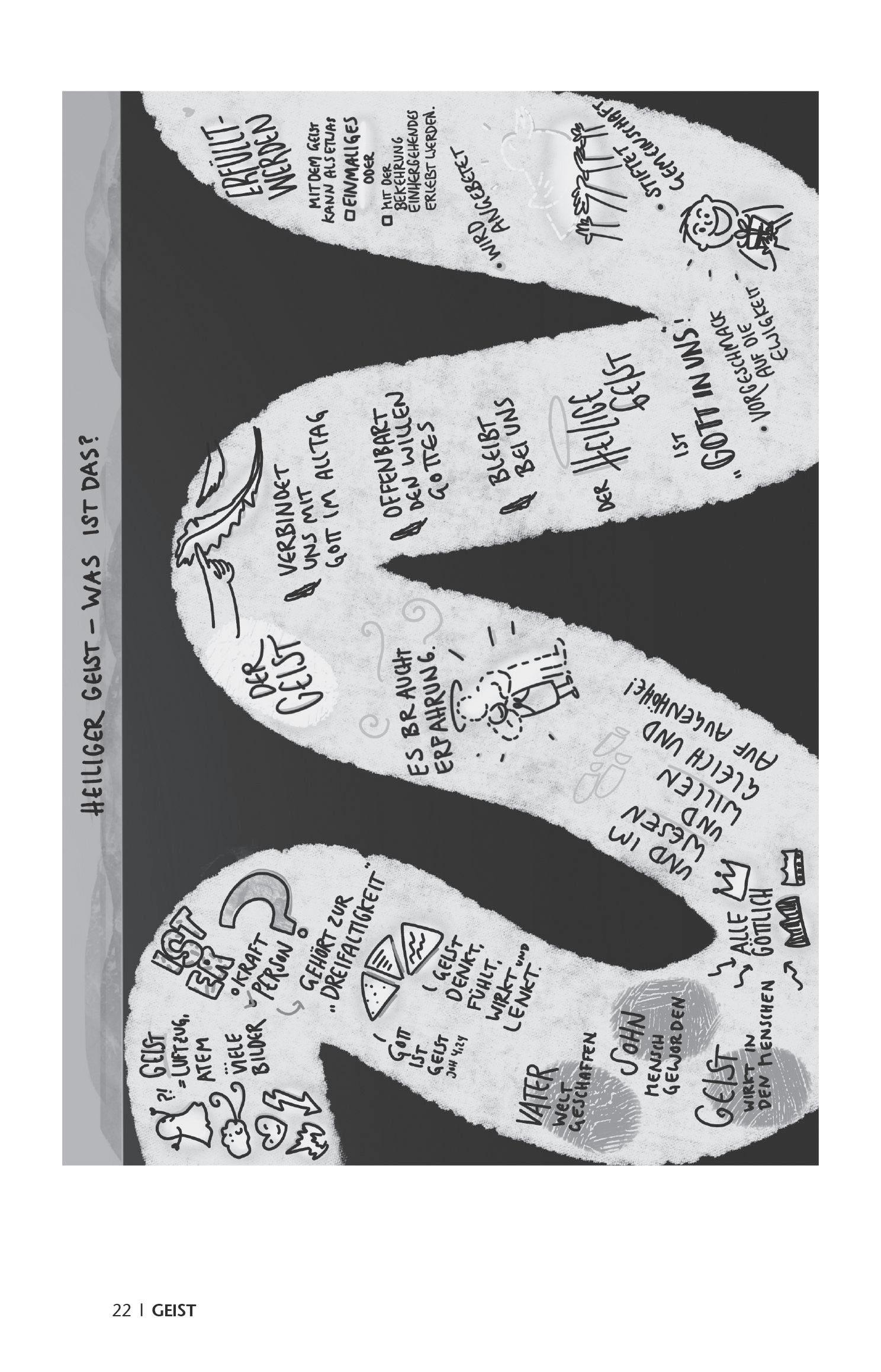 istfürunsunsichtbar.Deshalbfälltesschwer,sichGottkonkretvorzustellen.InJesusoffenbartsichGottaufeinefürunsMenschen nahbareWeise.Eristbeschreibbarundsichtbar,sodasseingreifbaresBildentsteht.FürdenHeiligenGeist findensichhingegenwenig konkreteStellen überdasAussehen,dieHerkunftoderseinenZustand.Wirwissennur,dasserwieGottauchunsichtbarist,dasser wieGottfühlenunddenkenkannundinderBibelsehrpersönliche FürwörterfürdenGeistverwendetwerden.Paulusschreibtdem GeistaucheineneigenenWillenzu:„Aberdasallesbewirkteinund derselbeGeist.Erteiltjedem[...]zu,ganzso,wieereswill“ (1.Kor12,11BB).AuchdasApostelkonzilwählteineFormulierung, diedenWillendesGeistesbetont:„DennesgefälltdemHeiligen Geistunduns“(Apg15,28aLu).ImNeuenTestamentspricht,lehrt, vertrittundordnetderGeistGottesundhilftderjungenGemeinde. DerHeiligeGeistscheintalsobeideszusein:PersonundWirkung.