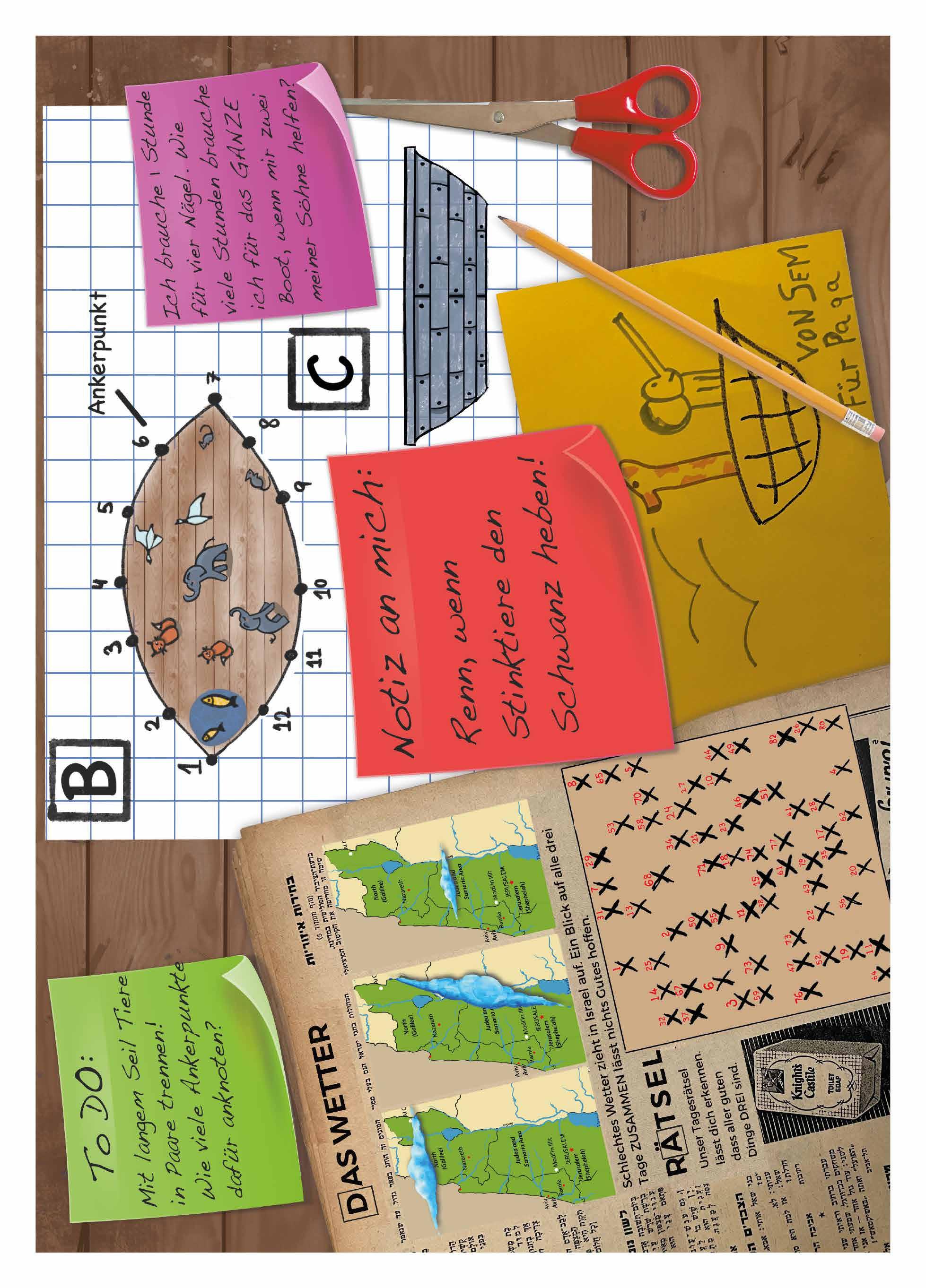 Auf dem weißen, karierten Papier ist die Arche aus der Vogelperspektive zu sehen. Auf der Arche sind Tiere. An der Seite sind Ankerpunkte abgebildet. Der grüne Notizzettel links vom Papier erklärt, dass mit einem durchgängigen „Seil“ alle Tiere voneinander getrennt werden müssen.