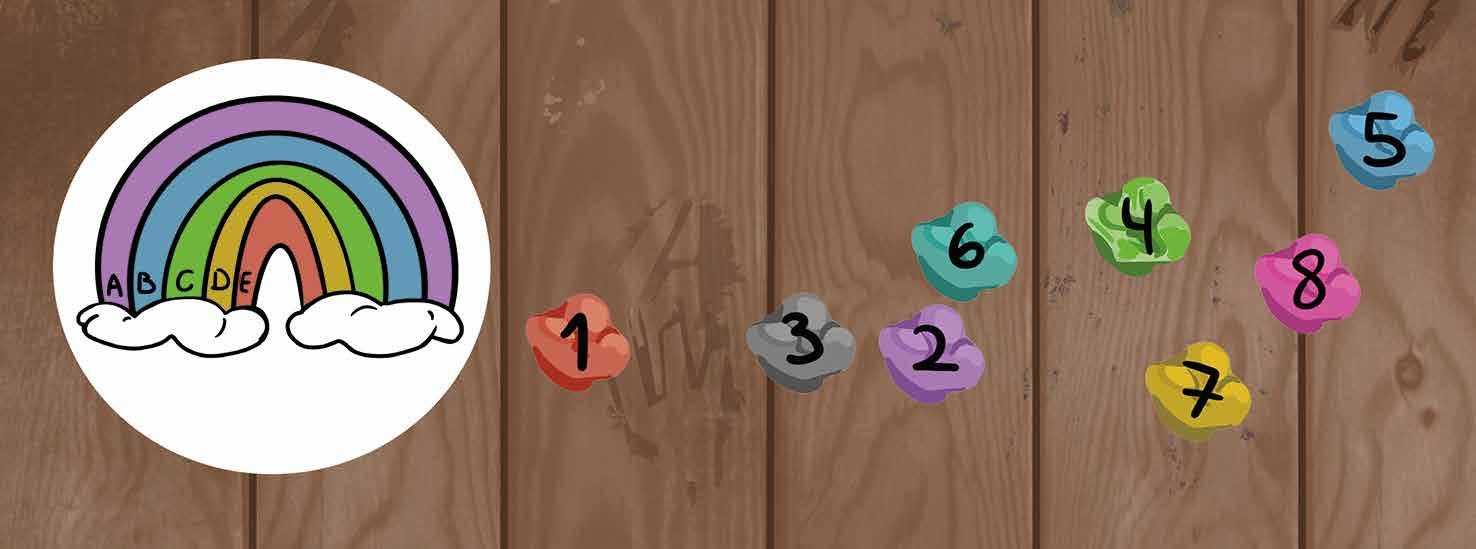 Hinweis 3: Bei der Lösung zum Rätsel, das zu den jeweiligen Buchstaben gehört, habt ihr eine Zahl herausgefunden. Wie könnt ihr jetzt den Regenbogen an den richtigen Stellen bunt einfärben? (Auf den Kaugummis auf der Unterseite des Schreibtisches sind Zahlen zu erkennen. Die Farben müssen entsprechend der jeweiligen Lösungszahl je Rätsel ins jeweilige Buchstabenfeld im Regenbogen übertragen werden.)