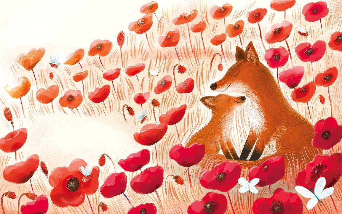 Der große Fuchs und der kleine Fuchs entdecken ein Feld voller wunderschöner Mohnblumen, die sich sanft im Wind wiegen.