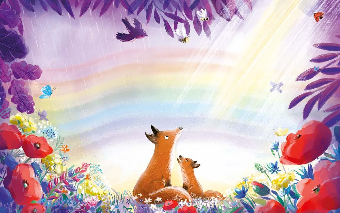 Das Sonnenlicht bricht hinter den Wolken hervor. Die beiden Füchse staunen über den bunten Regenbogen, der nun am Himmel steht.