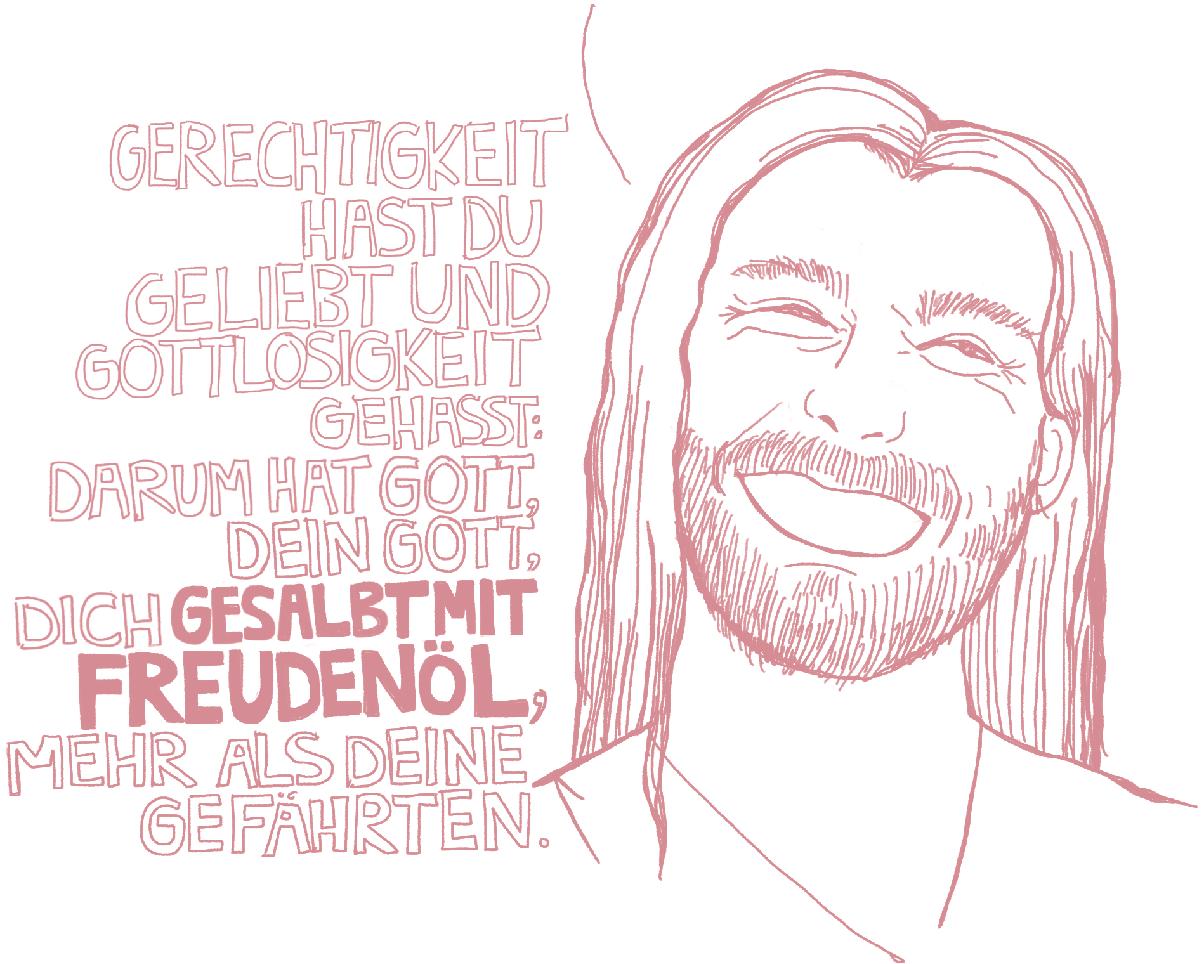 Jesus ist mehr als alle Menschen mit Freudenöl gesalbt. Das ist eine sehr poetische Ausdrucksweise, die einfach bedeutet, dass er fröhlicher und glücklicher als jeder andere Mensch ist. Um Jesus herum war Freude, Lachen und Zuversicht. Er war so sicher in der Liebe des Vaters, dass er von Herzen dienen und lieben konnte.