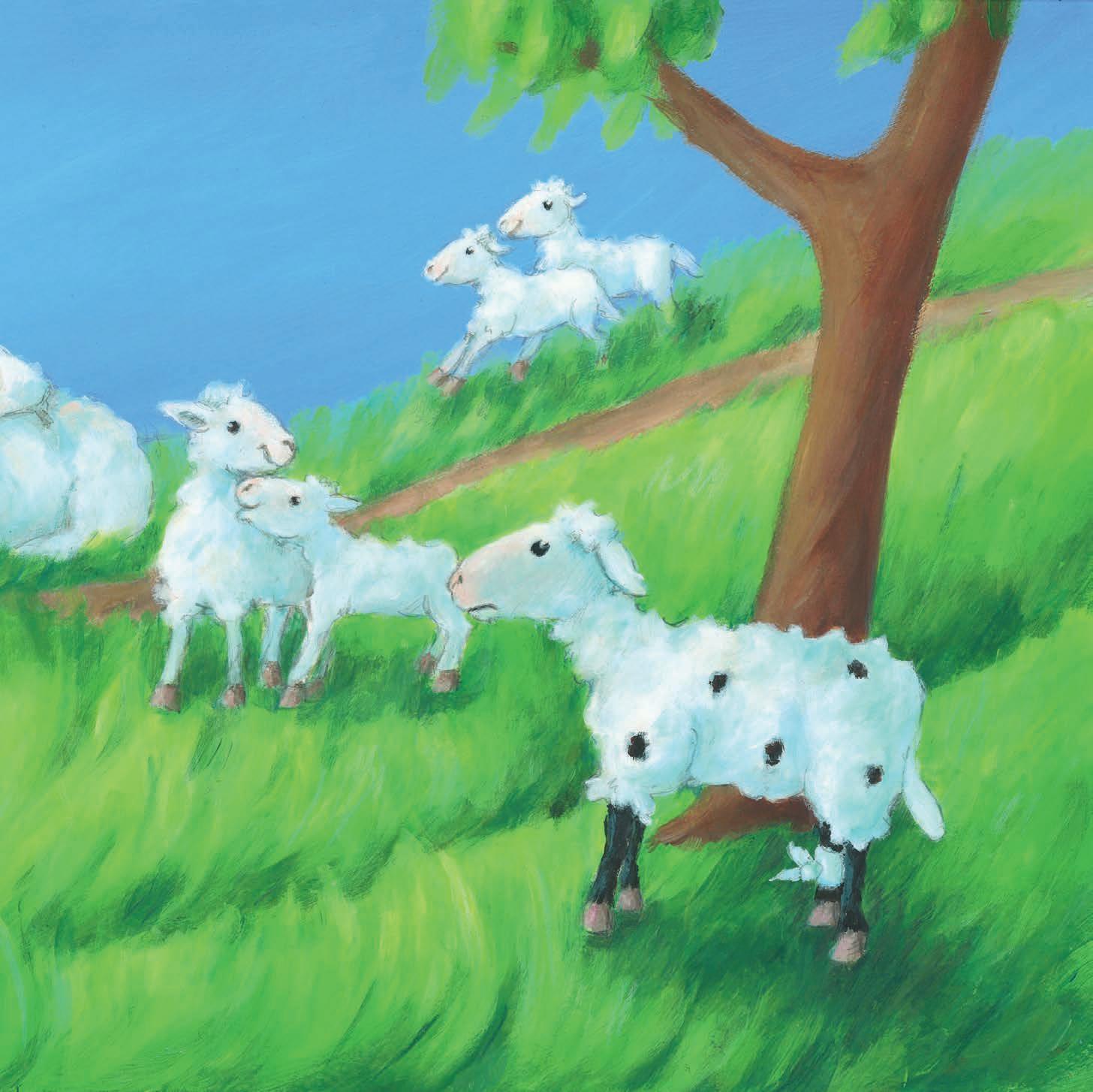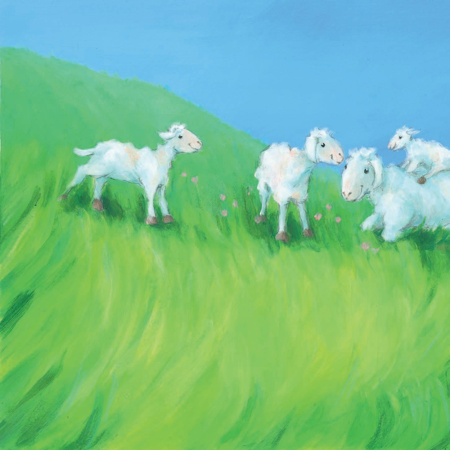 Joschi konnte den anderen Schafen nur dabei zusehen, wie sie herumrannten und spielten. Deshalb fühlte er sich oft sehr traurig und einsam – außer in Annabelles Nähe.