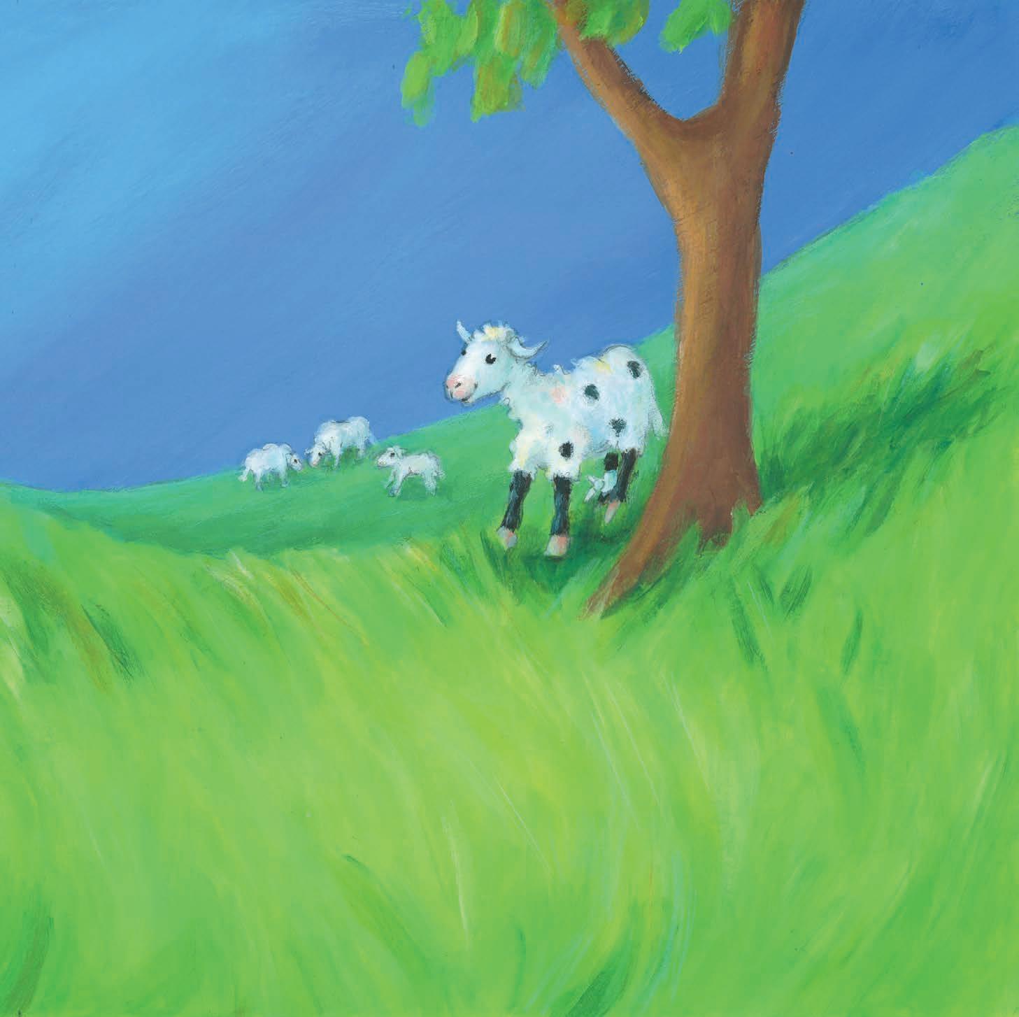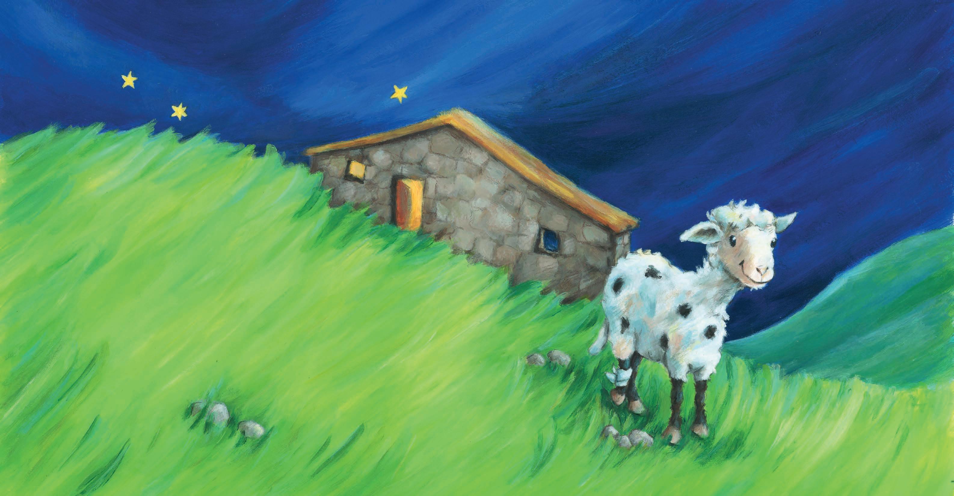 In einem sonnigen Tal lebte das kleine Lamm Joschi. Es hatte weißes Fell mit schwarzen Flecken und dazu noch schwarze Beine. Deswegen war Joschi unglücklich, denn alle anderen Lämmchen hatten schneeweißes Fell, ganz ohne Flecken.