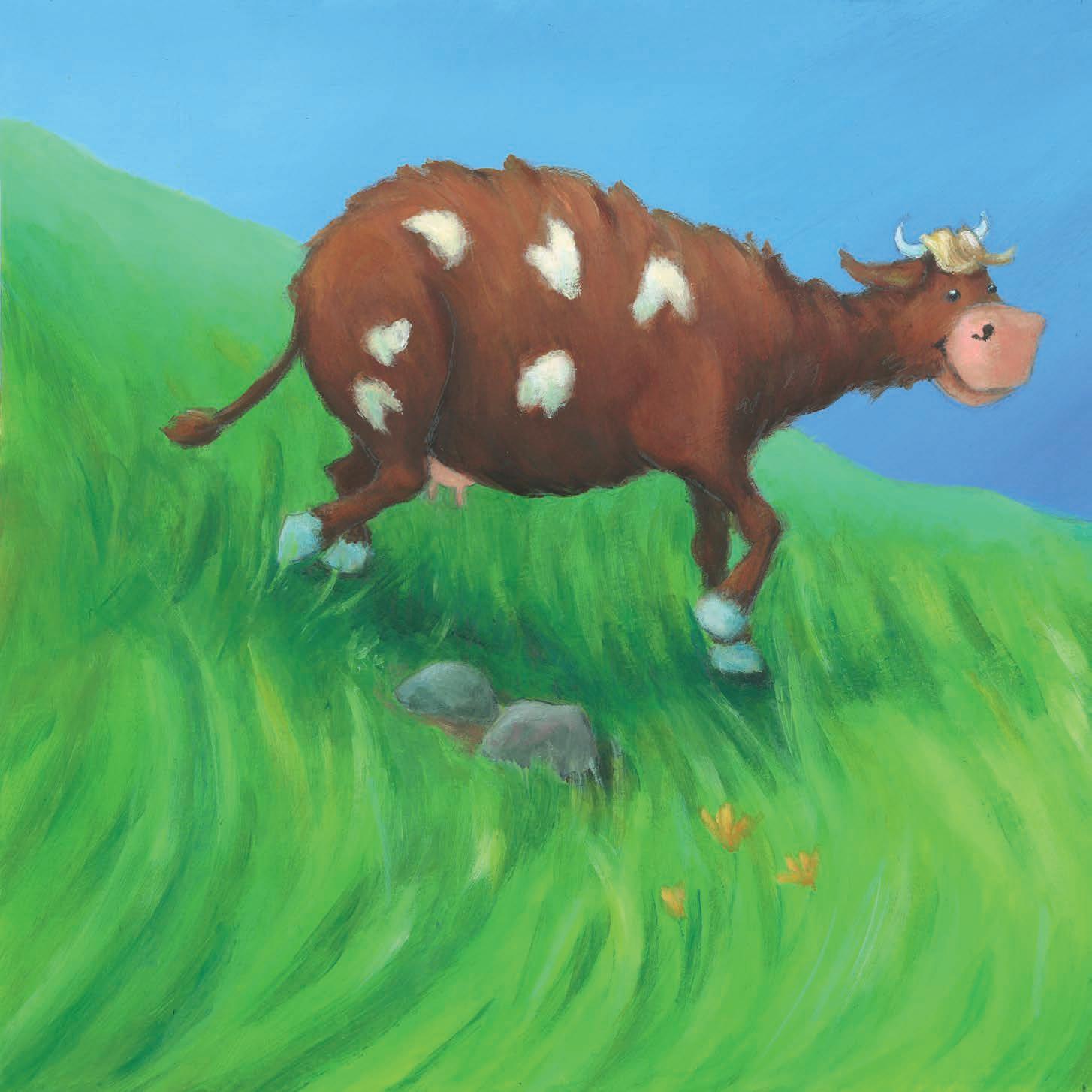 größer als er – sie war nun mal eine Kuh. Ihr braunes Fell hatte weiße Flecken, die wie Regenpfützen auf einem Weg aussahen. Ihr Bauch war so rund wie eine Tonne, und ihre Stimme klang immer sanft und freundlich.