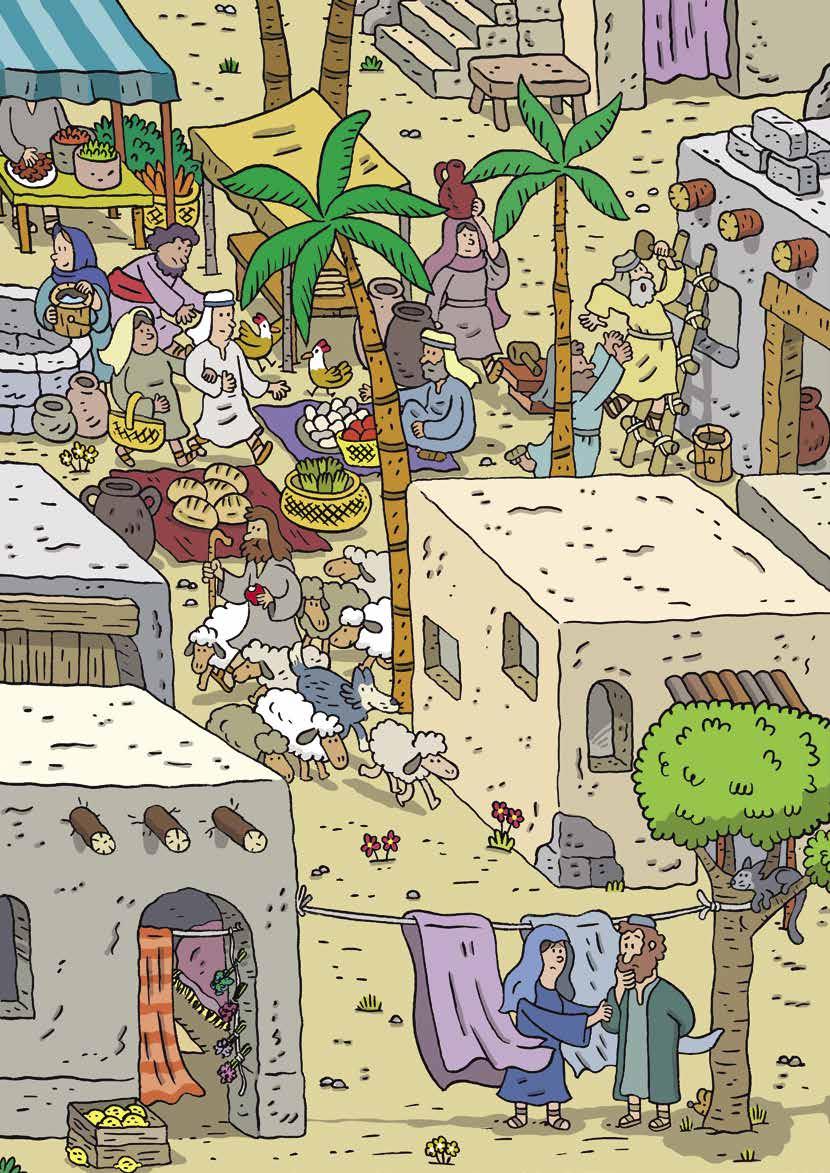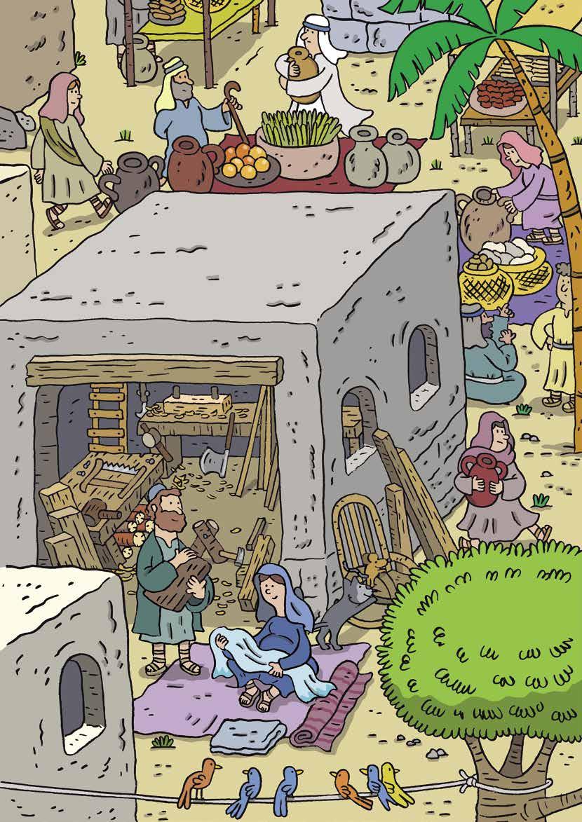 Schon früh am nächsten Morgen machte er sich deshalb wieder auf den Weg zu der Stadt Nazareth. Schon von Weitem sah er, dass Maria draußen vor ihrem Haus stand. Neben ihr war ein Mann. Die beiden unterhielten sich miteinander.
