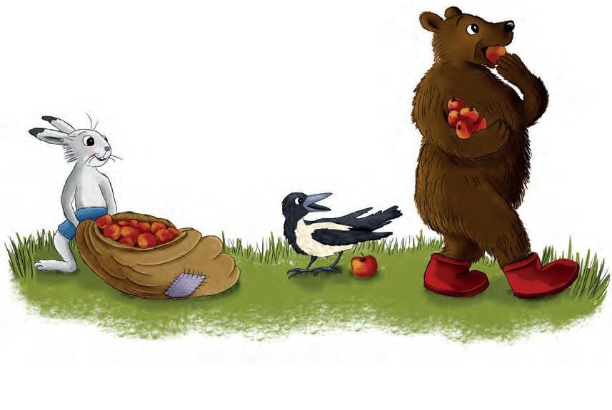 Der Bär probiert erst einen Apfel. „Nicht schlecht, deine Äpfel!“, gibt er zufrieden von sich. Dann nimmt er sich eine große Tatze voll davon mit und geht seinen Weg. Und der Hase macht sich auf den Weg nach Hause.