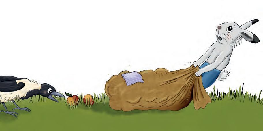 Der Hase füllt seinen Sack bis zum Rand. Jetzt ist der Sack so schwer, dass er ihn gar nicht heben kann. Mit viel Mühe schleift der Hase den Sack rückwärts hinter sich her.