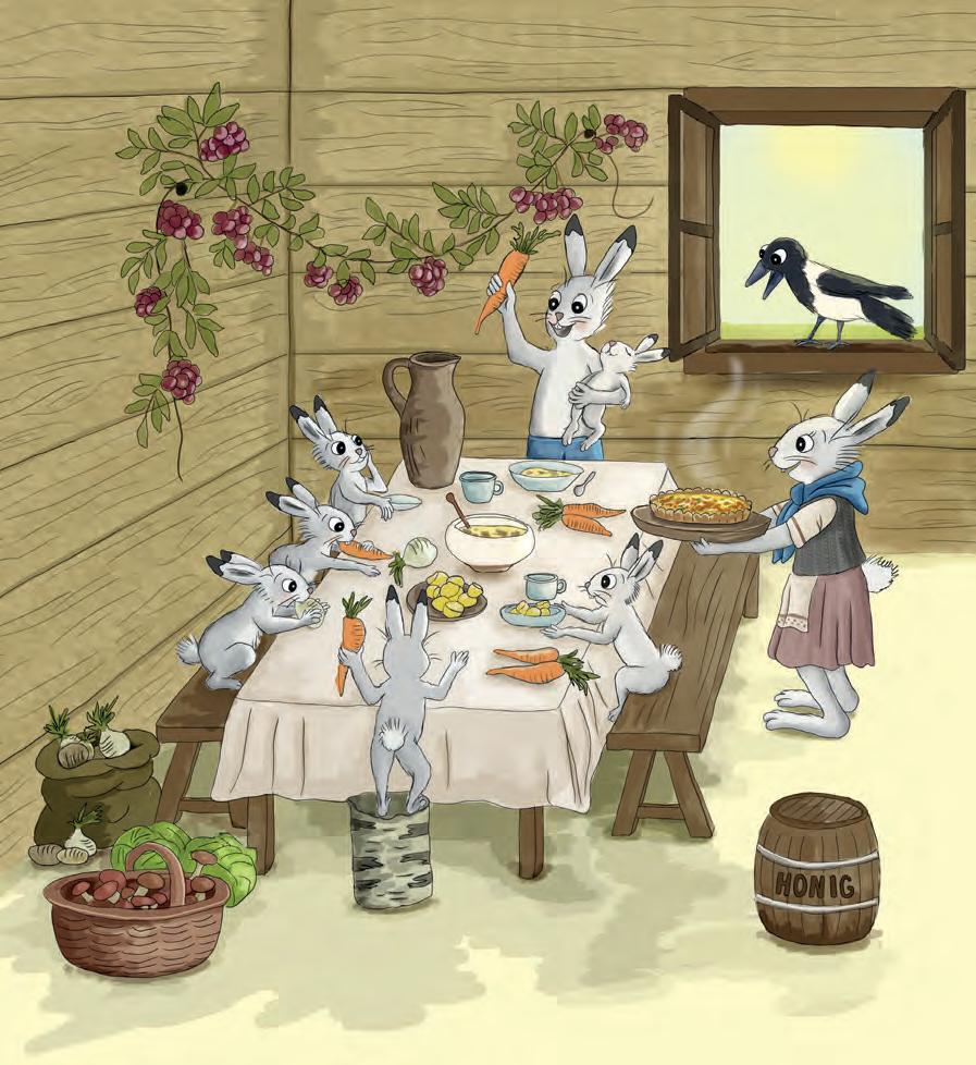 Am nächsten Tag versammelt sich die ganze Hasenfamilie um den gedeckten Tisch. Und wie reich ist der Tisch doch gedeckt! Pilze und Nüsse, Rüben und Kohl, Möhren, Kartoffeln – und sogar Honig! Und die gierige Elster wundert sich: „Das verstehe ich nicht! Wie hat er nur aus einem leeren Sack so viele gute Sachen herausgeholt?“