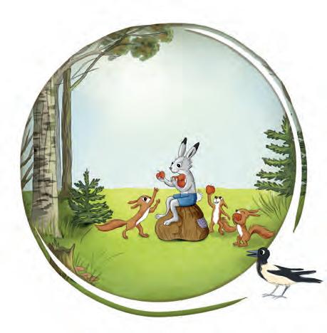 Als der Hase weiter durch den Wald geht, kommen von allen Seiten kleine Eichhörnchen herbeigehüpft. „Lieber Hase! Gib uns Äpfel!“