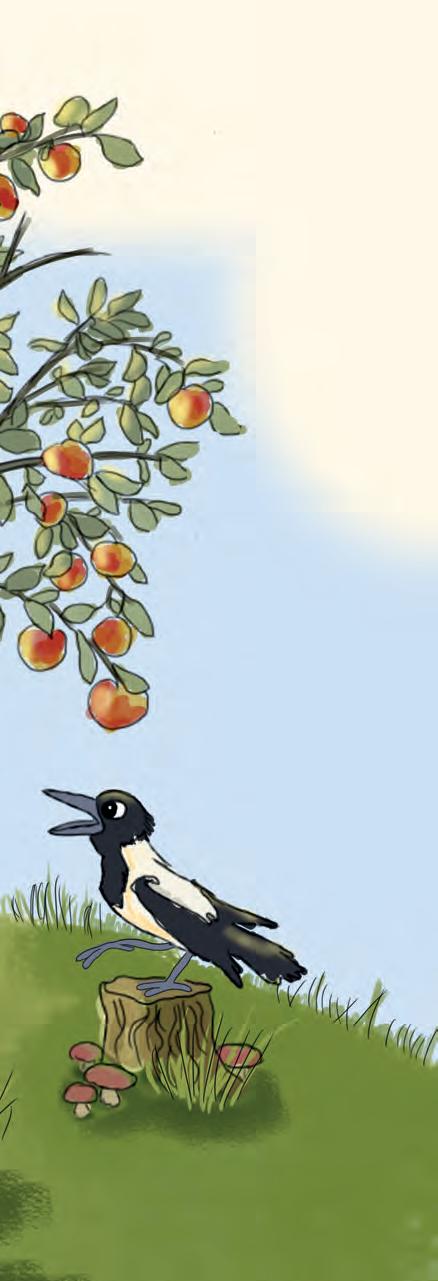 Da kommt plötzlich eine Elster angeflogen, setzt sich auf einen Baumstumpf und krächzt: „Unverschämtheit! Hier bleiben ja keine Äpfel mehr übrig!“
