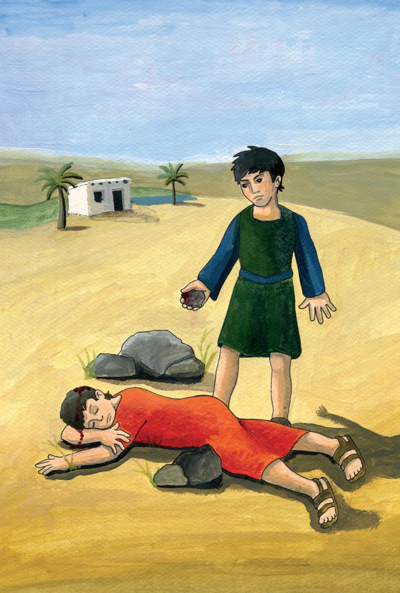 Dann bekam Eva noch einmal einen Sohn; den nannte sie Abel. Abel wurde ein Schafhirte und Kain wurde ein Ackerbauer. Abel versorgte seine Schafherde und passte auf sie auf, und Kain legte Äcker an, auf denen er Getreide und Gemüse anbaute. Eines Tages wollten Kain und Abel Gott ein Opfer darbringen. Kain
