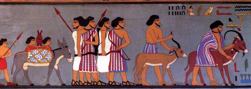 Wie sahen die Patriarchen aus? Die Malerei in einer Grabkammer in Beni Hasan (Mittelägypten, um 1900 v. Chr.) zeigt eine Gruppe von Semiten, die nach Ägypten kommt, um mit Schminke zu handeln. Die Nomadensippe ist mitsamt Gepäck und Waffen unterwegs. Die Kleider bestehen aus zusammengenähten farbigen Stoffstreifen. Möglicherweise sah so auch der »bunte Leibrock« des Josef aus (1Mo 37,3.24.31f).