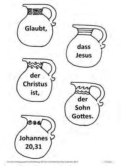 Mithilfe der beschrifteten Krüge (V 53-09.jpg) den Bibelspruch lernen und anschließend auf das gemeinsam gestaltete Bild kleben.