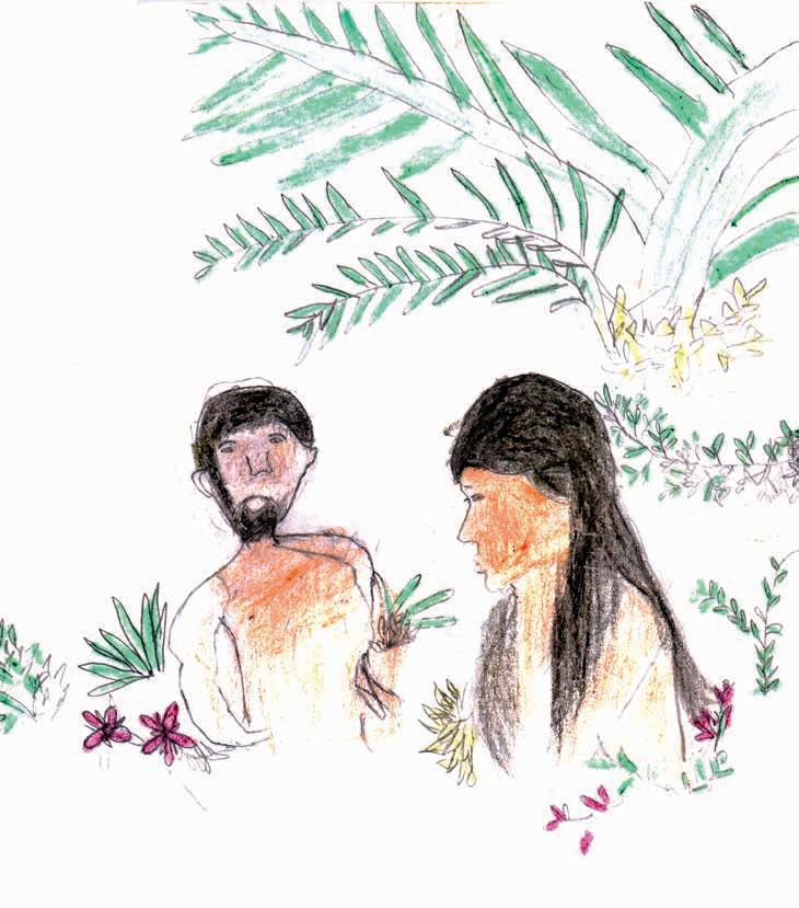 Gott sprach auch gern mit Adam und Eva. Er sagte zu ihnen: „Ihr dürft von allen Bäumen essen, die im Garten stehen, nur von einem nicht!“ Morgen erfährst du, wie es weiterging.