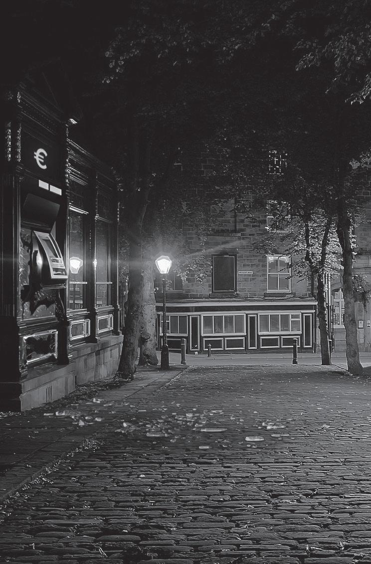 Plötzlich zerschlug ein lauter Knall die Stille der Nacht in tausend Teile. Es schepperte, Glas splitterte. Der Schreck durchfuhr Ronnys Körper, und ihm wurde kalt bis in die Fingerspitzen. Ungewollt rissen seine erschrockenen Arme den Lenker nach rechts. Da er immer noch zügig unterwegs war, rutschte das Rad zur Seite, stolperte über den Bordstein, kippte und riss seinen Fahrer mit sich zu Boden. Hart schlug Ronny mit Kopf und Rücken auf die Straße. Zum Glück trug er den Helm. Etwas regnete auf ihn herab, so groß und schwer wie Hagelkörner. Etwas, das weh tat auf der Haut. Instinktiv riss der Junge die Arme hoch, um sein Gesicht zu schützen. Als es aufgehört hatte zu regnen, blieb Ronny noch einen Moment benommen liegen. Es roch nach Feuerwerk. Mühsam versuchte er, seine Gedanken zu sortieren, und hob vorsichtig den Kopf. Eine kleine, dunkle Staubwolke zog aus der Sparkasse, verflüchtigte sich aber schnell. Schon über der Treppe, die auf den Bürgersteig hinabführte, verlor sie sich in der Nacht. Doch in dem Dunkel, aus dem sie gekommen war, schien plötzlich Licht. Es geisterte umher, flirrend wie ein oder zwei Glühwürmchen. Mal taumelte es in die Höhe, dann fiel es wieder zu Boden. Der Bankomat! Im Vorraum der Filiale steht doch der Geldautomat!, dachte Ronny blinzelnd. Dann legte er den Kopf wieder ab und bewegte seine Arme und Beine. Glück gehabt: Sie schienen in Ordnung zu sein! Langsam schob er das Rad von seinem Bein und setzte sich auf. Im Schein der Straßenlaterne sah er, dass seine Kleidung mit Glasstückchen übersät war. Zum Glück hatten sie keine scharfen Kanten, sondern abgerundete Ecken und alle eine ähnliche Größe. Sicherheitsglas! Es hatte ihn nicht verletzt. Das laute Klingeln war noch da, aber es klang anders als noch