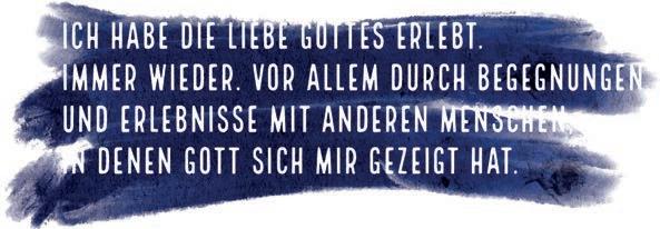 Aber: Diese Liebe lohnt sich und ist spannend. Sie macht Spaß, ist romantisch, rührt zu Tränen, trägt in Durststrecken und ist einfach wunderbar. Sie ist kreativ, voller Fragen, voller Antworten, aber auch voller Herausforderungen. Es ist die Liebe Gottes zu uns Menschen, die sich auf unsere zwischenmenschlichen Beziehungen auswirkt und so erfahrbar wird. In Worten und Taten. Beides ist mir sehr wichtig.