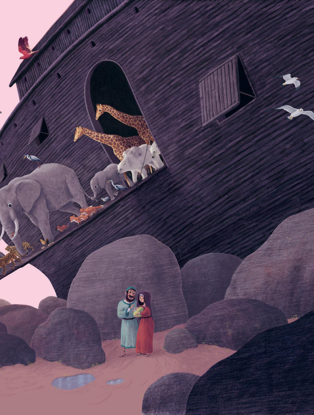 Noah, seine Familie und die Tiere, die sich auf Gottes Rat auf der Arche in Sicherheit gebracht haben, stehen wieder auf festem Boden.